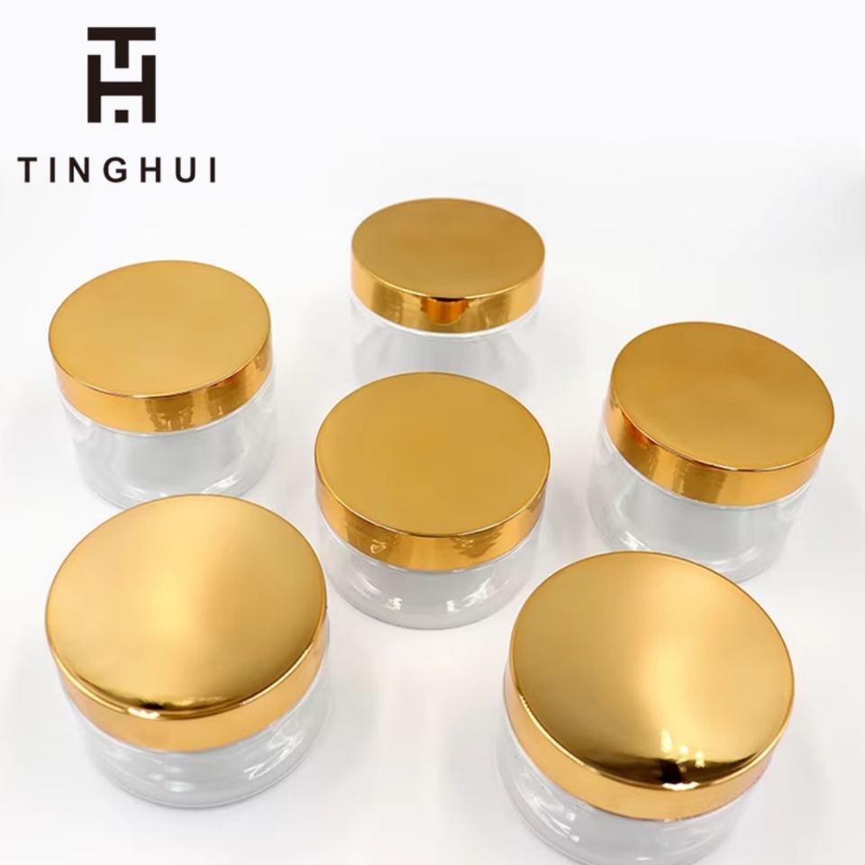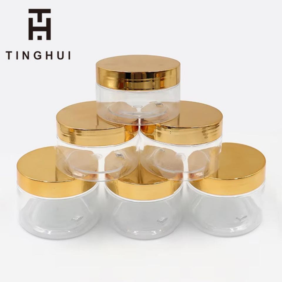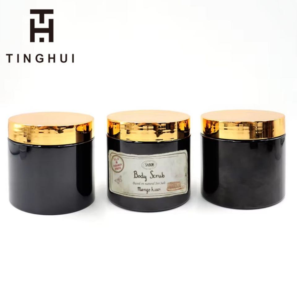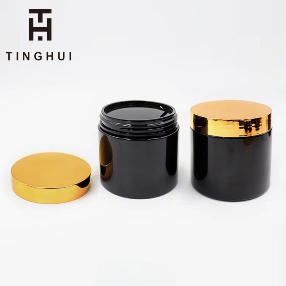 บรรจุภัณฑ์เครื่องสำอางแบบกำหนดเอง ขนาด 250 มล. 8 ออนซ์ ฝาสีทองหรูหรา ภาชนะพลาสติกสีดำเกรดอาหารพร้อมฝาปิด