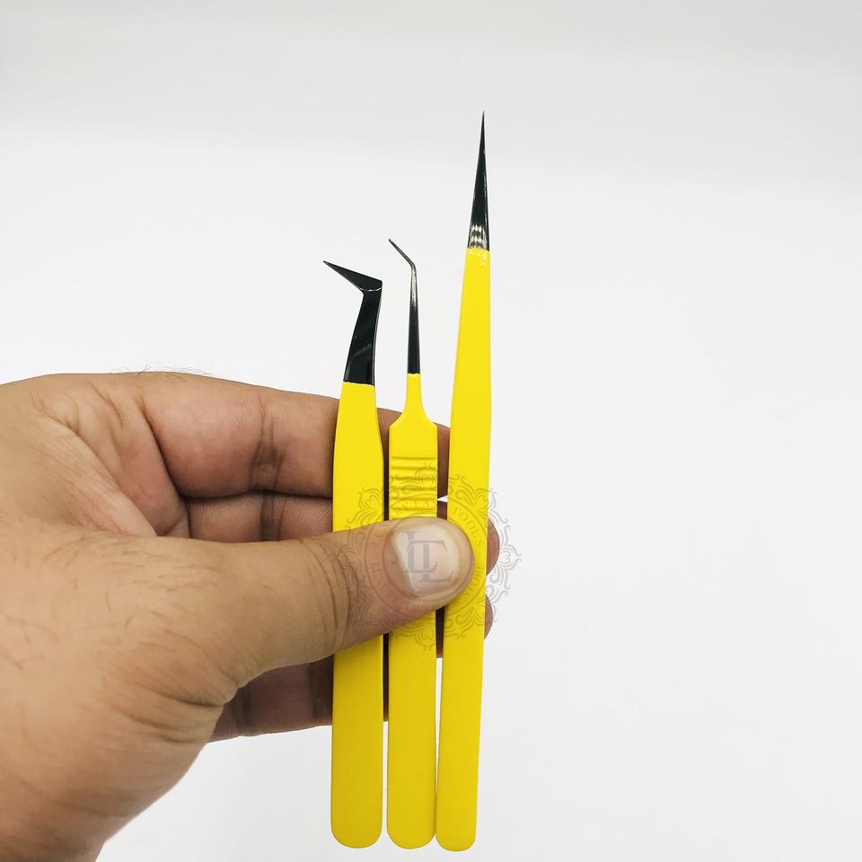 แหนบปลายต่อขนตาสีเหลืองพลาสม่าสีดำฉลากแบบยั่งยืนทดสอบด้วยมือจากสเตนเลสแบบยั่งยืน
