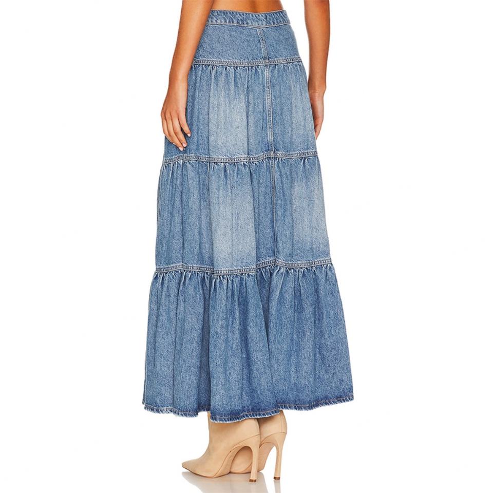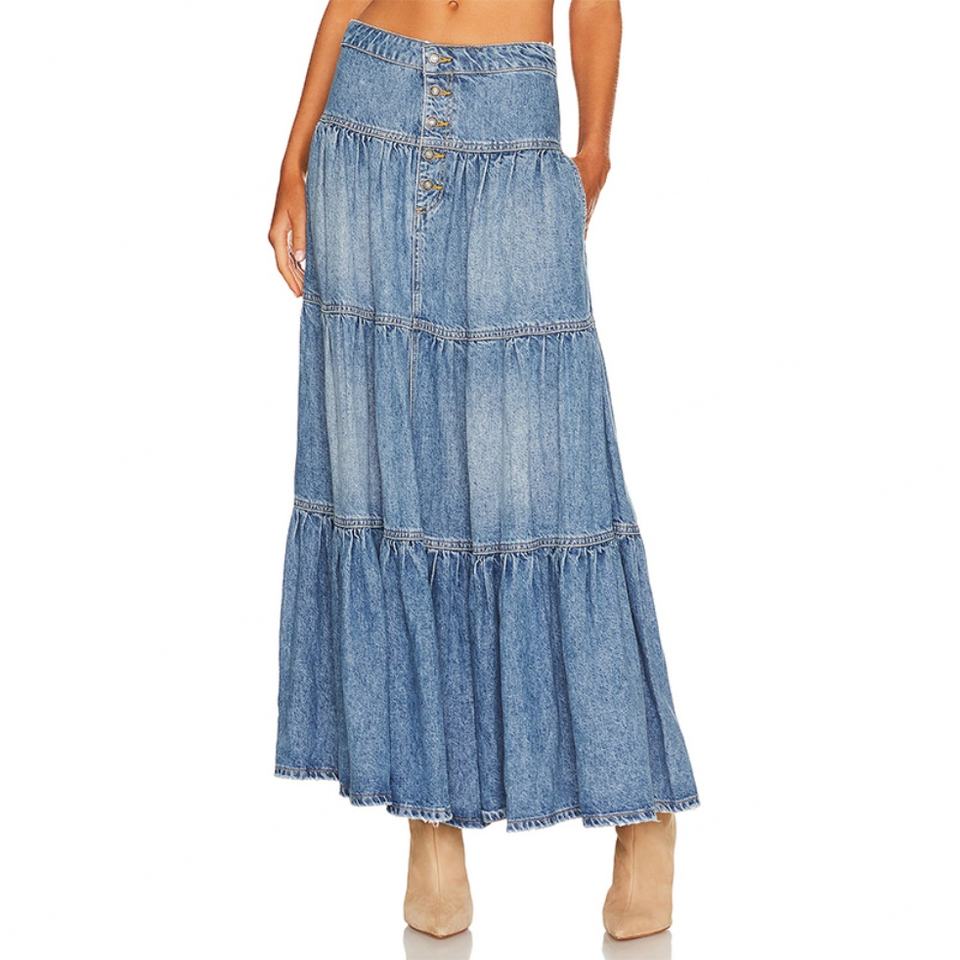กระโปรงยีนส์ยาวทรงหลวมสีน้ำเงินสำหรับผู้หญิง แต่งกระดุมผ่าหน้า มีกระเป๋าข้าง