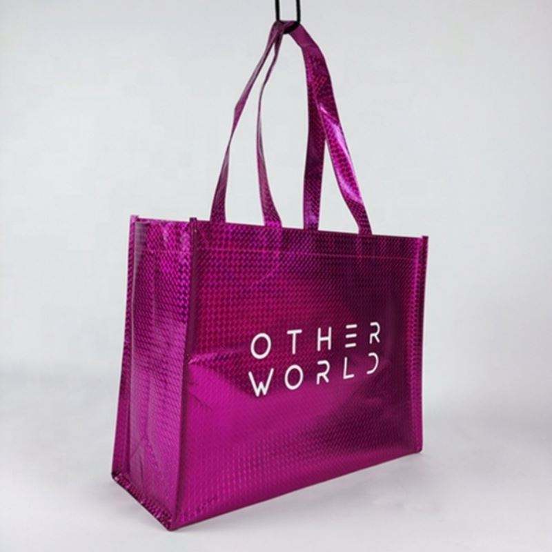 ถุงช้อปปิ้งแบบไม่ทอเคลือบลามิเนตสีชมพูถุงรีไซเคิลพร้อมโลโก้ออกแบบได้ตามต้องการ