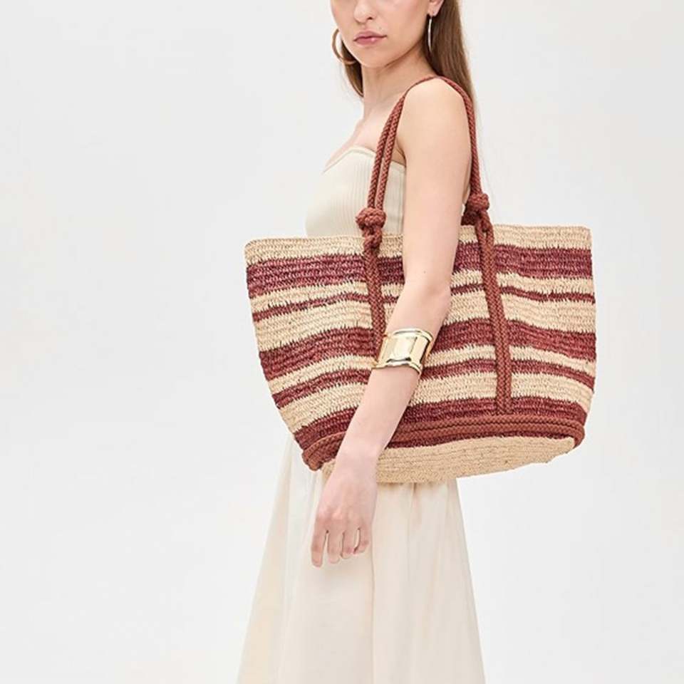 กระเป๋าถือชายหาดลายทางสำหรับผู้หญิงไซส์ใหญ่ ฤดูร้อน/ฤดูหนาว/ฤดูใบไม้ผลิ กระเป๋าสะพายไหล่แบบถัก แบบเปิดปิด พกพาสะดวก สำหรับเดินทางและช้อปปิ้ง