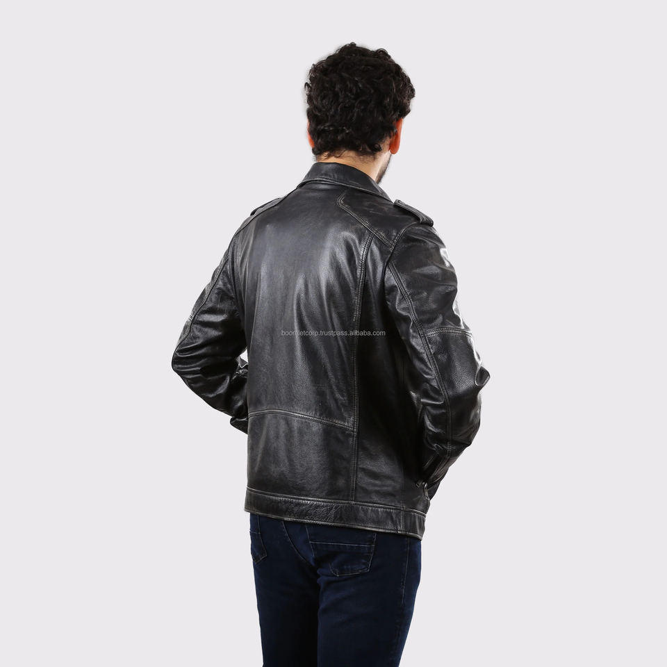 แจ็คเก็ตบอมเบอร์หนังแท้สไตล์นักขี่มอเตอร์ไซค์และไบค์เกอร์ คอทรงโอ ปักโลโก้ด้านหน้า ผ้าแคนวาส แห้งเร็ว คลาสสิก สำหรับผู้ชาย