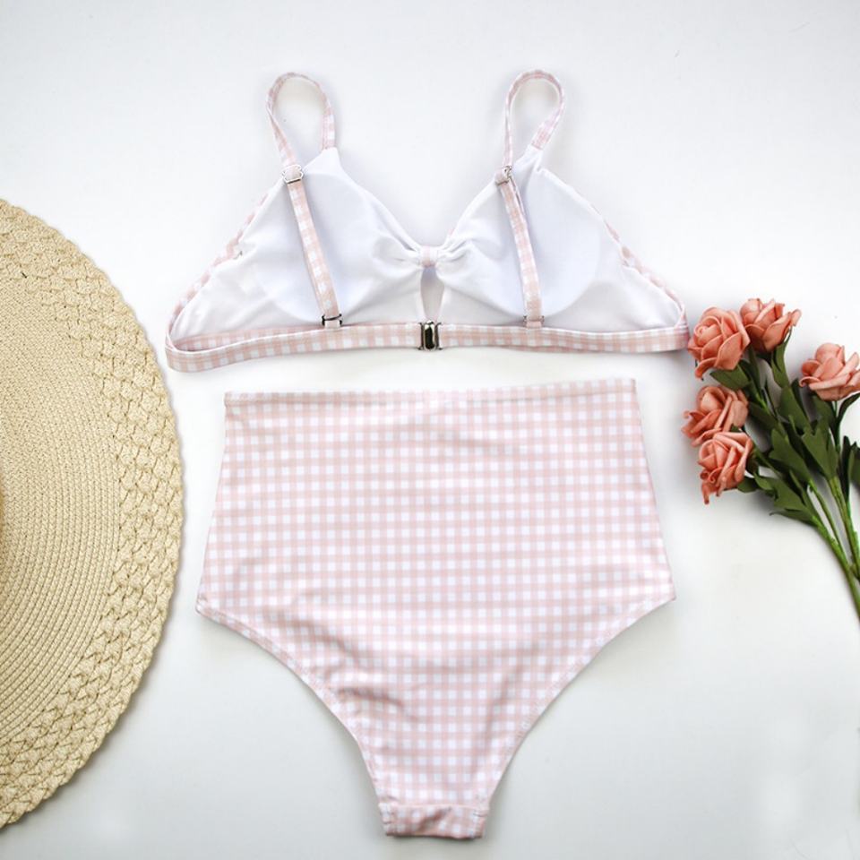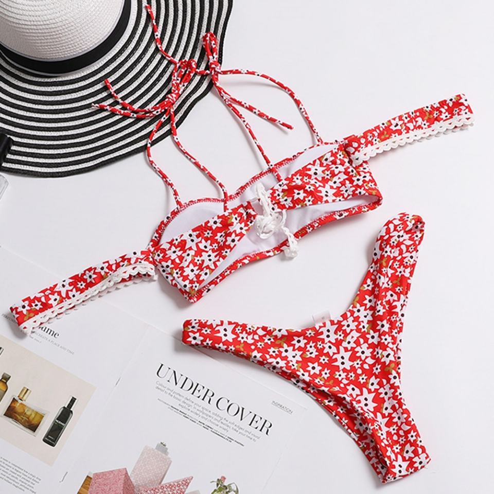 ชุดบิกินี่ลายเสือดาวแบบผูกคอและกางเกงว่ายน้ำวีสตริง 1 ชิ้น ชุดว่ายน้ำผู้หญิงเซ็กซี่ โลโก้ด้านหน้า ระบายอากาศได้ดี แห้งเร็ว