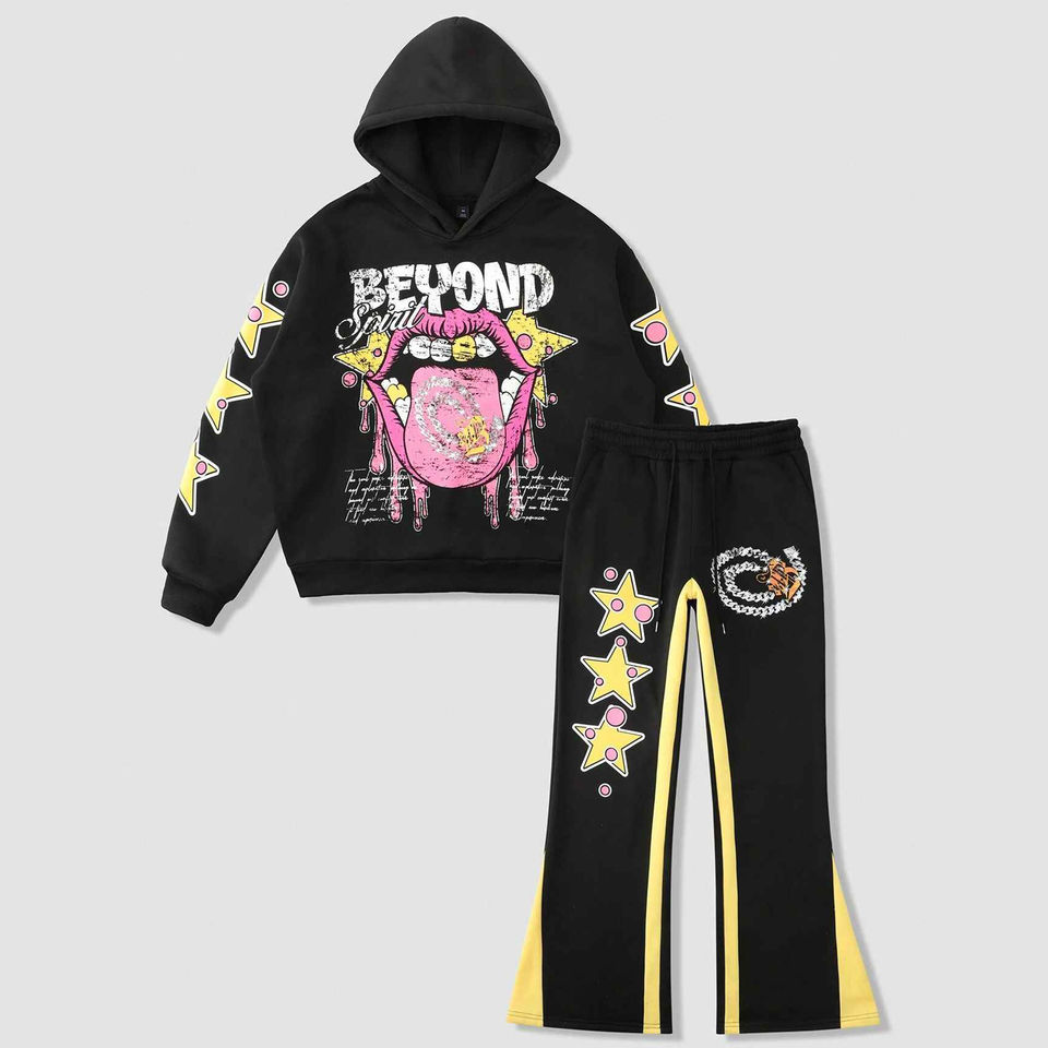 ชุดวอร์ม2ชิ้นมีฮู้ดสำหรับผู้ชายพิมพ์ลายตัวอักษรและรูป DTG ชุดวอร์ม2ชิ้นแบบลำลองกำหนดเอง