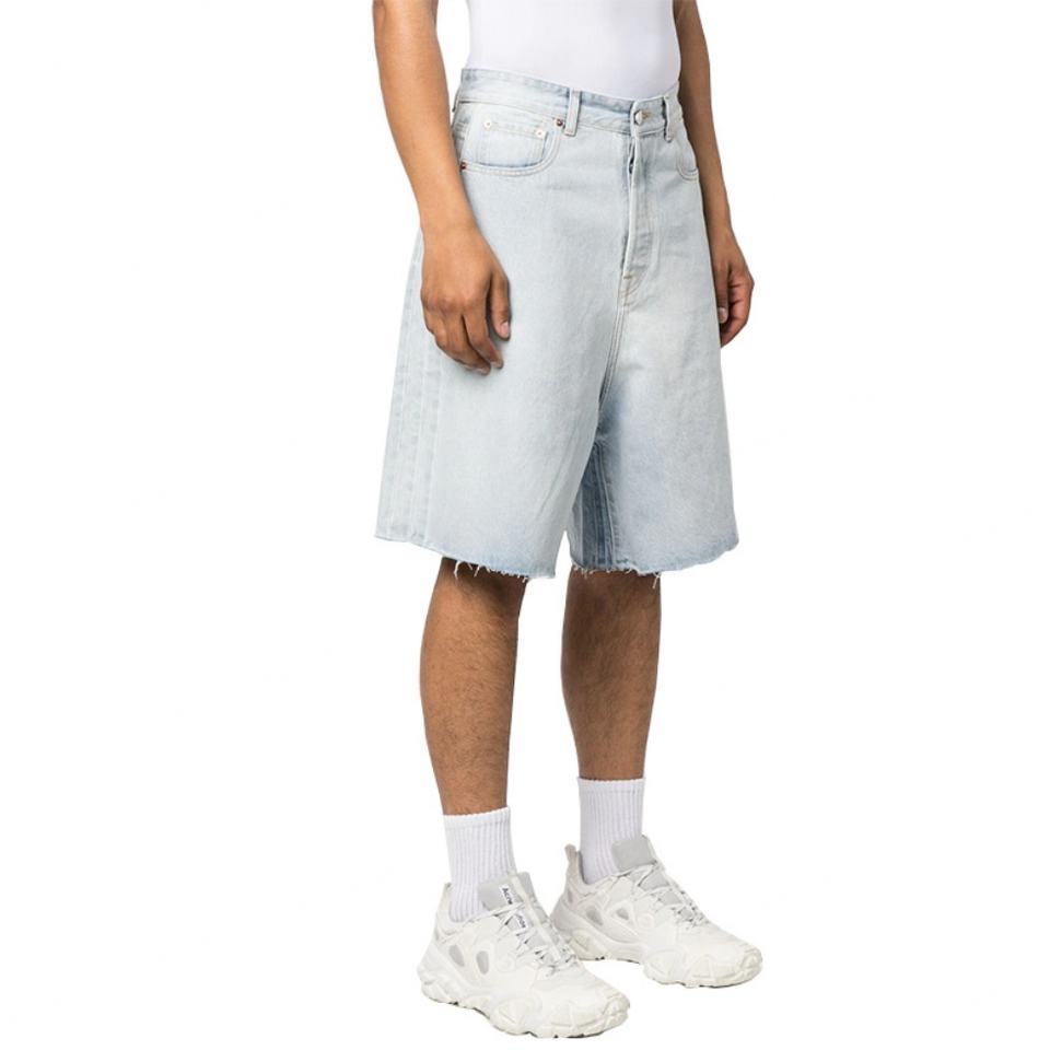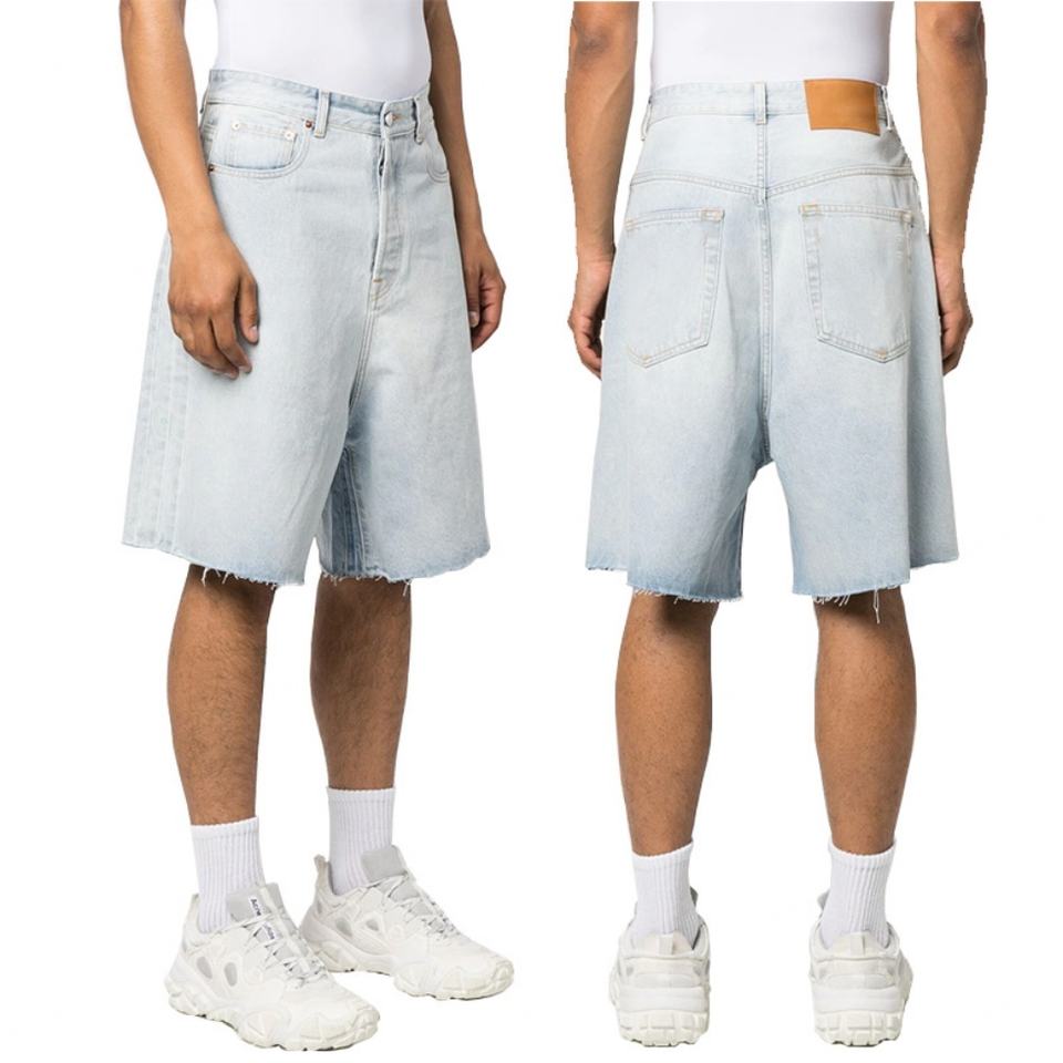 กางเกงยีนส์ขาสั้นทรงหลวมสีฟ้าอ่อนผ้าฝ้ายขอบดิบสำหรับผู้ชาย