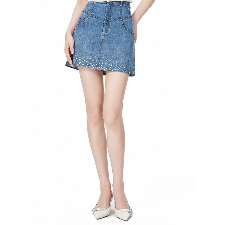 กระโปรงยีนส์สีฟ้าอ่อนแบบสั่งทำสำหรับผู้หญิง ผ้าฝ้าย 100% เอวสูง สไตล์วินเทจ ซักฟอกแล้ว กระโปรงสั้นสำหรับผู้หญิง