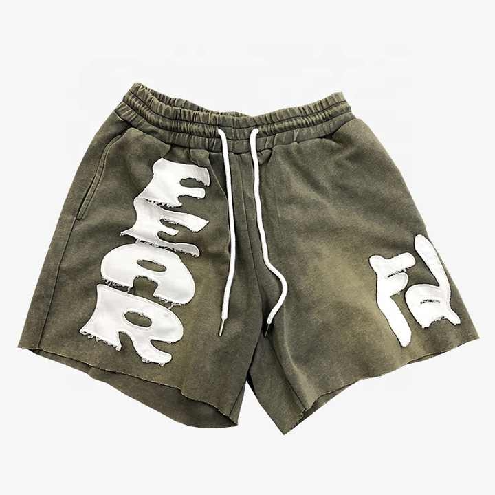 กางเกงขาสั้นผ้าฝ้ายกันเหงื่อสีเขียวอ่อนตามสั่งสำหรับผู้ชายซักกรดและแดดจางลงเย็บปักเย็บขอบสำหรับฤดูใบไม้ผลิ