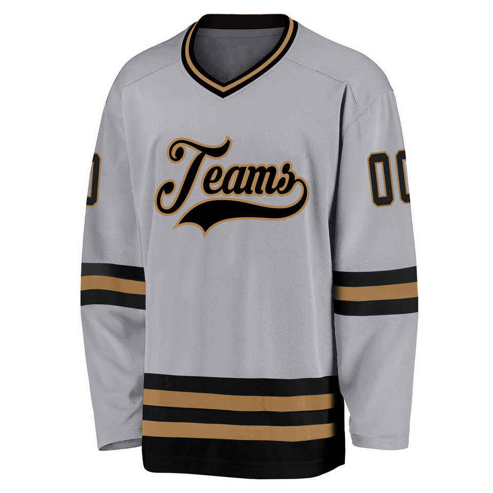 เสื้อฮอกกี้น้ำแข็งสีเทาอ่อนแบบกำหนดเอง ชุดทีมมืออาชีพ ลายทางสีดำทอง ชุดกีฬา ชุดกีฬาฮอกกี้แบบส่วนตัว