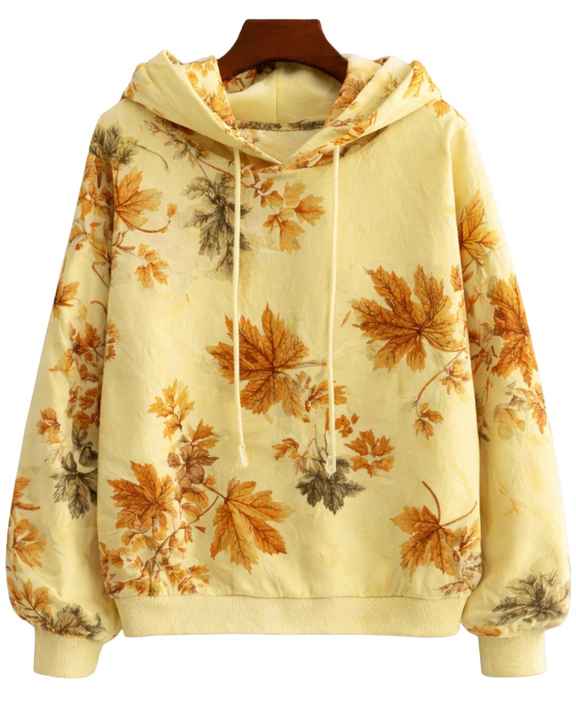 Custom Light Yellow Autumn Leaf Print Women Hoodie Cotton Fleece Casual Pullover Custom Manufacturer Wholesale Apparel Supplier