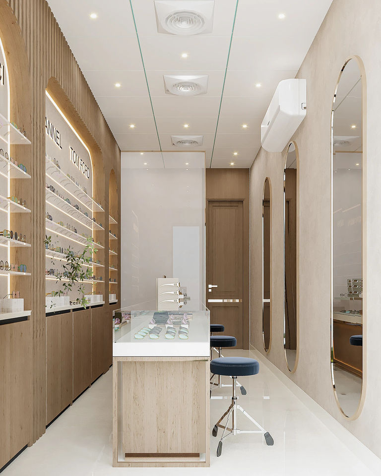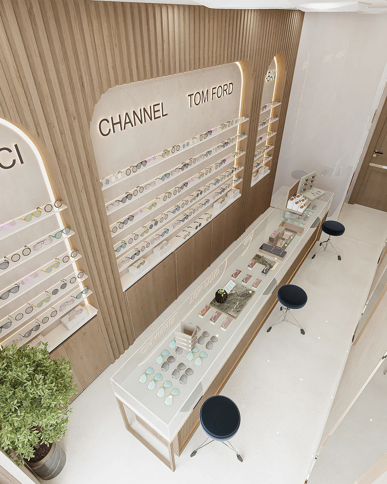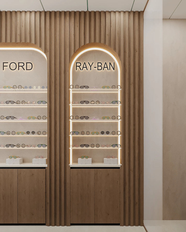 ตู้โชว์กระจกไม้สำหรับร้านค้าปลีก พร้อมไฟ LED แบบกำหนดเอง ดีไซน์ทันสมัย สำหรับร้านแว่นตา