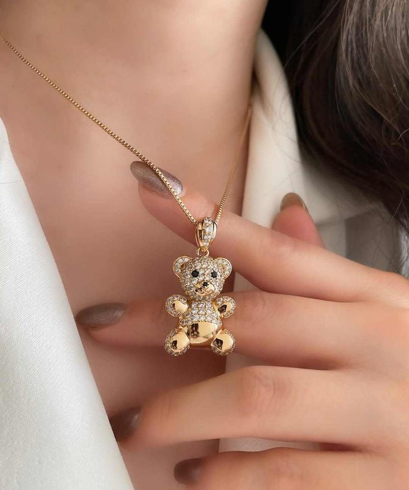 จี้หมีเท็ดดี้ขนาดเล็กสั่งทำพิเศษ ชุบทอง 18K ทำจากสแตนเลสประดับเพชรโมอิสซาไนต์ สำหรับสร้อยคอ