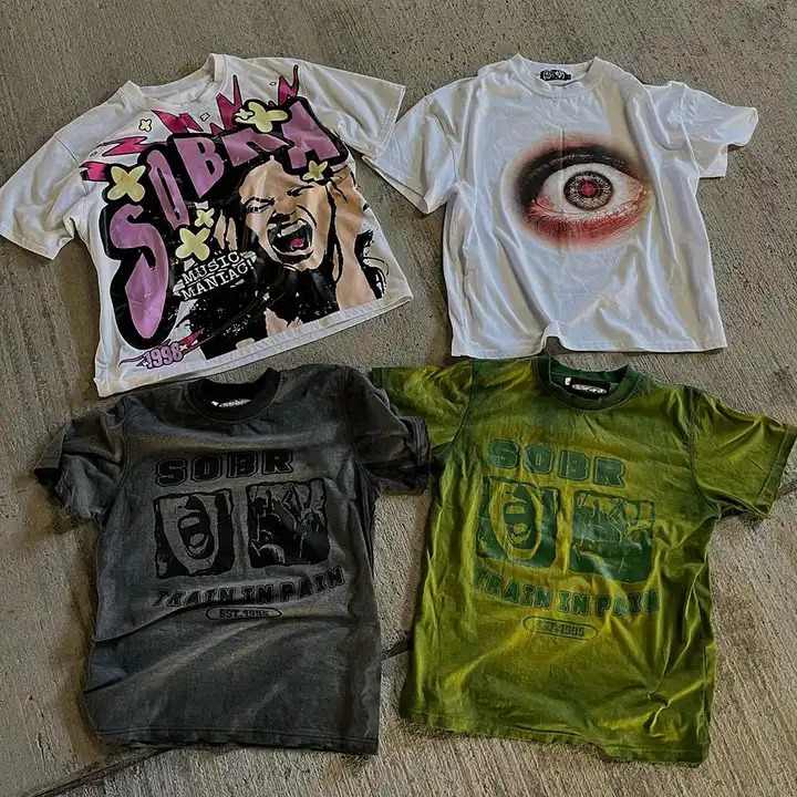 เสื้อยืดผ้าฝ้ายฟอกสีกรด:เสื้อยืดลายกราฟิกแบบเรียบง่าย