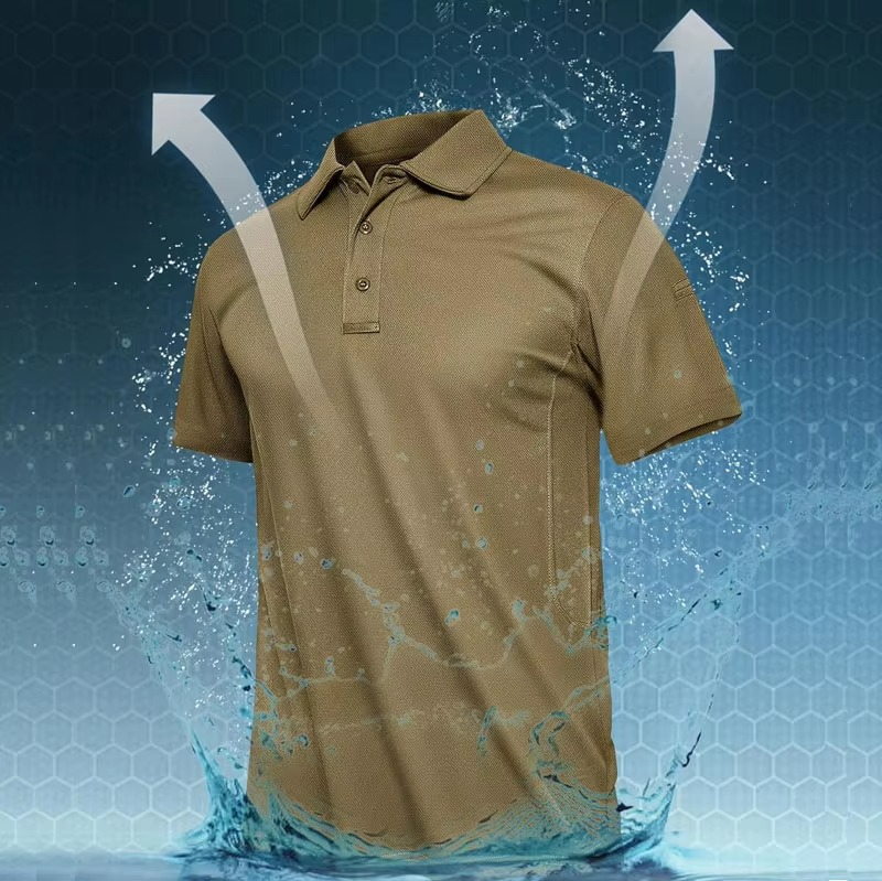 เสื้อโปโลผู้ชายผ้าโพลีเอสเตอร์แห้งเร็วเสื้อยุทธวิธีแขนสั้น100% โลโก้ตามสั่ง