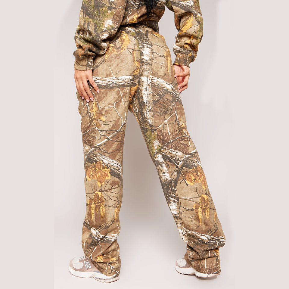 โลโก้ที่กําหนดเอง 2 ชิ้นเสื้อผ้าสตรีจริงต้นไม้ป่าพิมพ์ Camo ป่าล่าสัตว์เดินป่าตั้งแคมป์กางเกงบานกางเกงขากว้าง