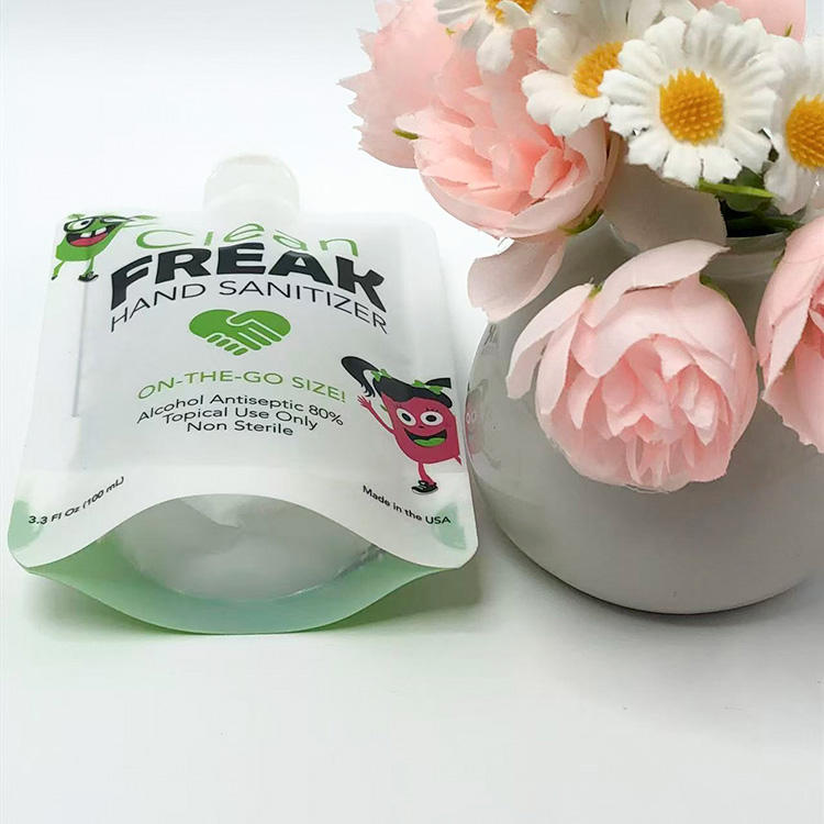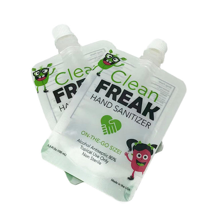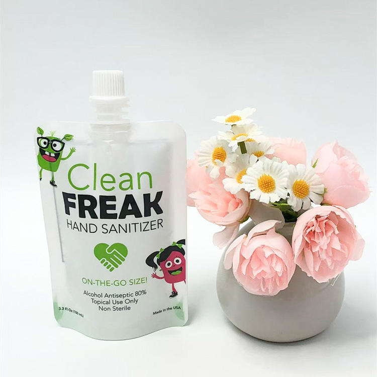 ซองพลาสติก PE สีขาวขนาด 3.3 ออนซ์ แบบตั้งได้ พร้อมจุกและคุณสมบัติป้องกันการเปิดโดยไม่ได้รับอนุญาต ปิดผนึกด้วยความร้อน สำหรับเจลแอลกอฮอล์ทำความสะอาดมือ Clean Freak พร้อมโลโก้สั่งทำพิเศษ