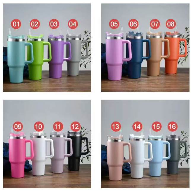 แก้วน้ำสแตนเลสสุญญากาศแบบมีหูจับและหลอดดูด ขนาด 40 ออนซ์ ผนังสองชั้น เก็บอุณหภูมิได้ พร้อมโลโก้สั่งทำ
