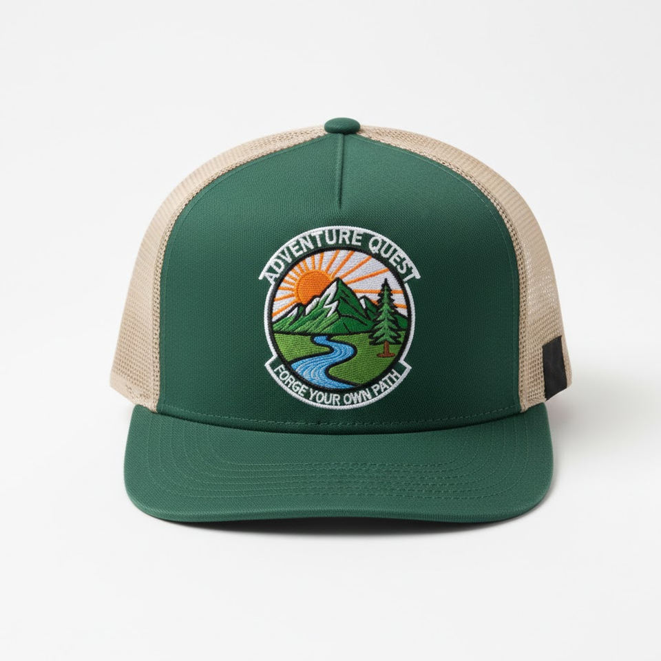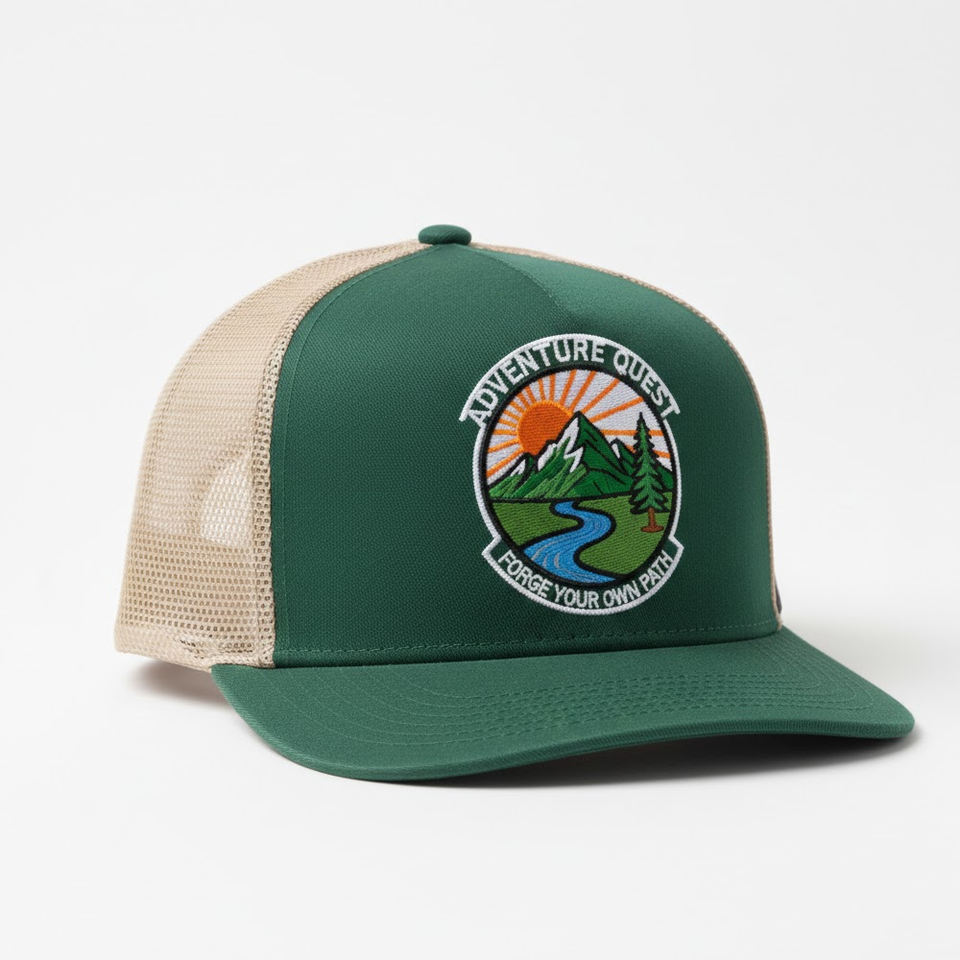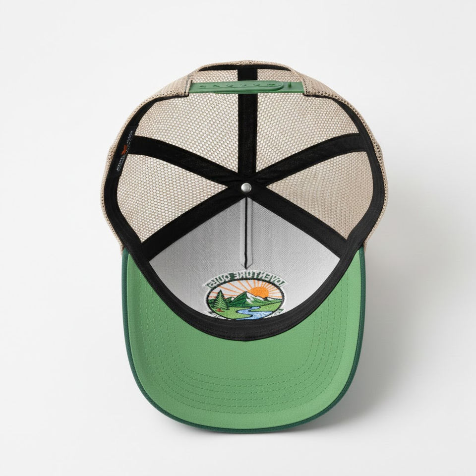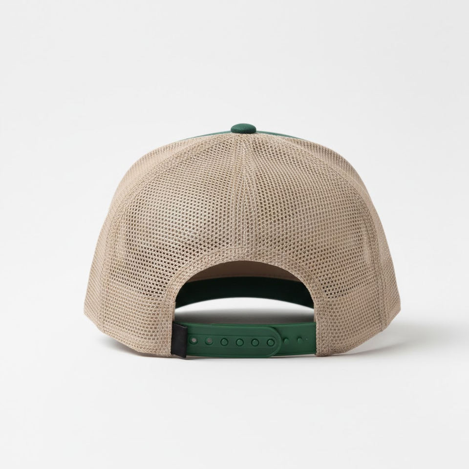 หมวกแก๊ปทรงทรัคเกอร์ 5 แผง สีเขียวเข้มและสีเบจ พร้อมปักลายธรรมชาติ แบบ Snapback รับทำโลโก้ตามสั่ง
