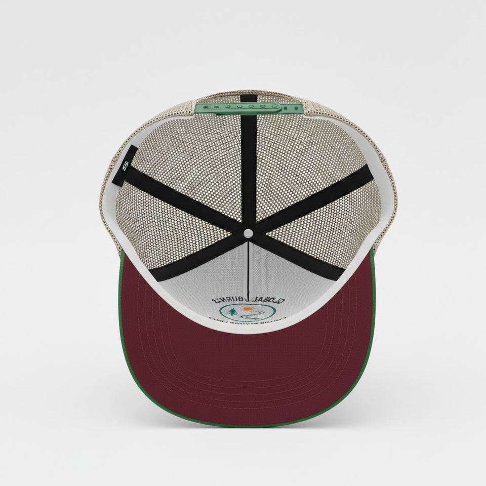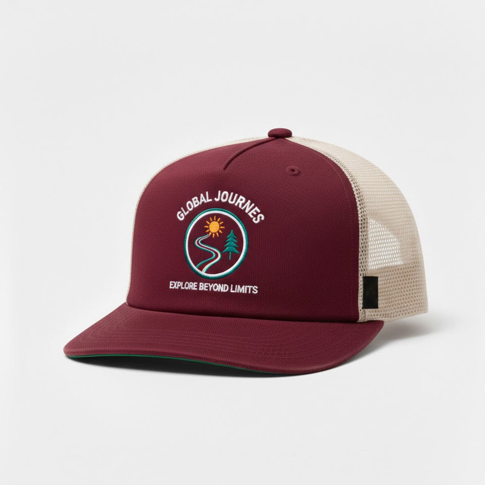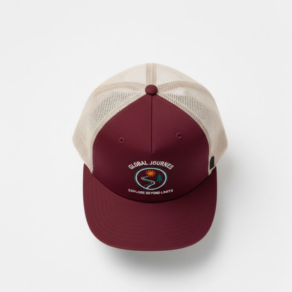 หมวกแก๊ปทรงสปอร์ต 6 แผง ปักโลโก้ตามสั่ง สีแดงเลือดหมู-ดำ หมวกตาข่ายแบบ Snapback ลายปัก Adventure ระบายอากาศได้ดี