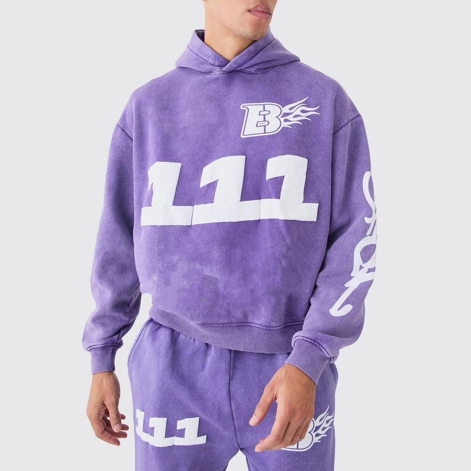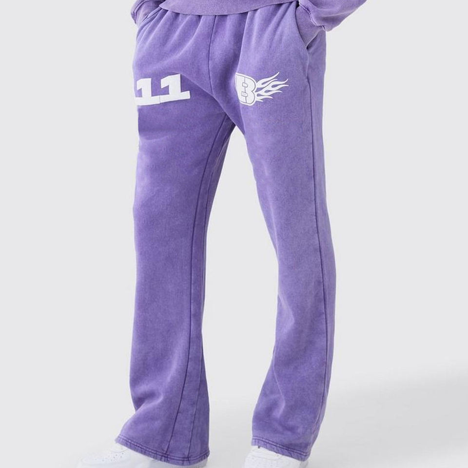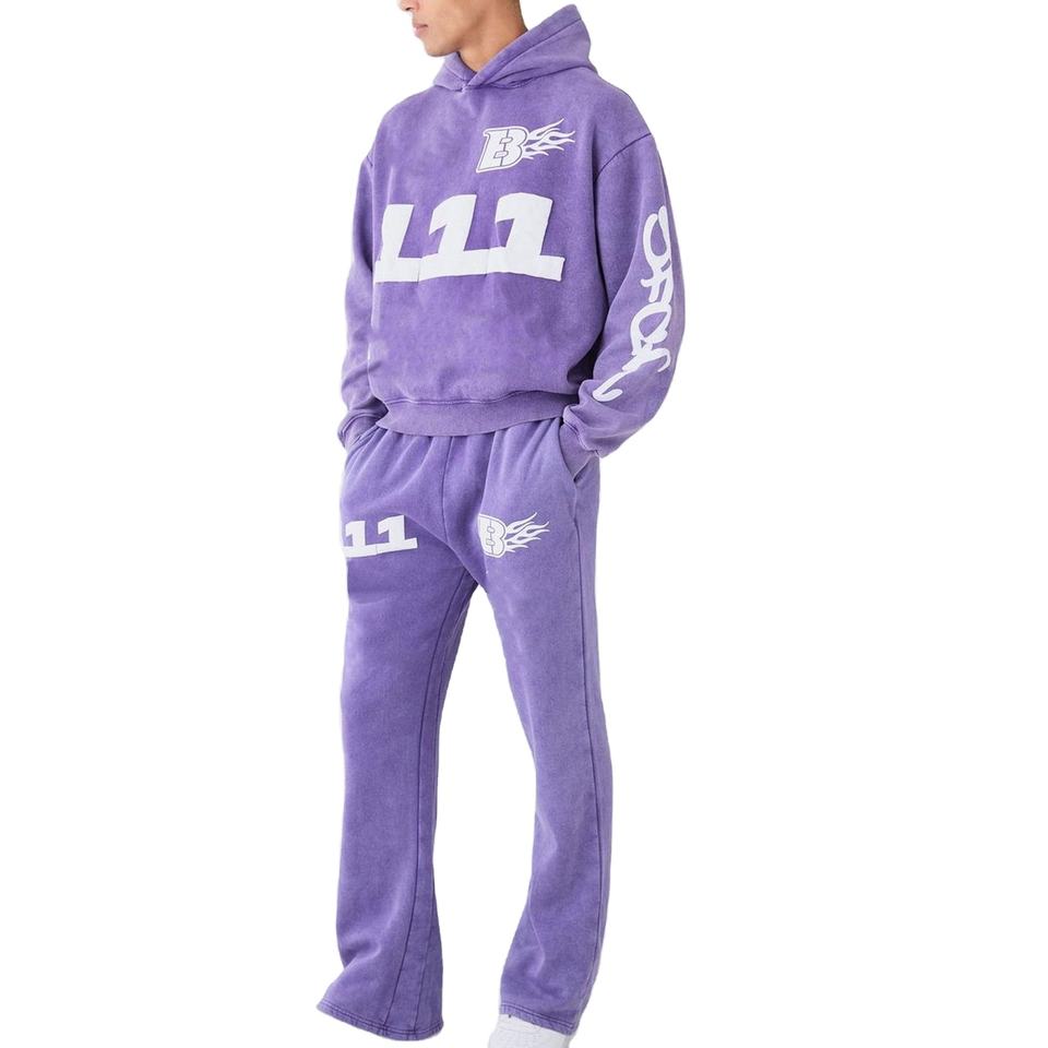 ชุดเซ็ตฮู้ดดี้ลายโลโก้แบบย้อมสีเอซิดและกางเกงขาบาน สไตล์สตรีทแวร์วินเทจสีม่วงสำหรับผู้ชาย ผ้าคอตตอนหนานุ่มทรงโอเวอร์ไซส์