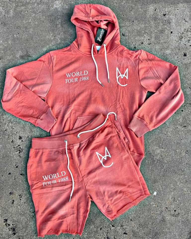 ชุดกีฬาแขนยาวมีฮู้ดสำหรับผู้ชายชุดวอร์มพิมพ์ลายสกรีนเสื้อฮู้ดและกางเกงขาสั้นแนววินเทจสามารถซักได้โลโก้ตามต้องการ