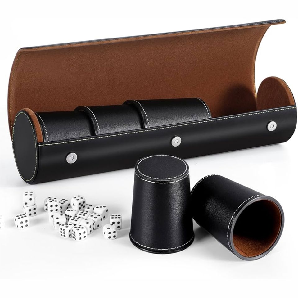 ชุดกล่องถ้วยลูกเต๋าหนัง PU สีน้ำตาลมีโลโก้ตามสั่งภายในมีถาดด้านในและสแนปสำหรับลูกเต๋า yahtze/ คนโกหก