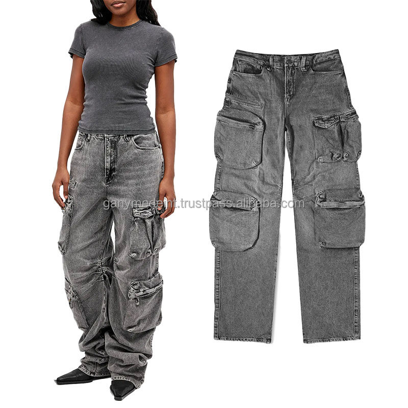 กางเกงยีนส์ทรงหลวมมีกระเป๋าหลายกระเป๋าสำหรับผู้หญิงใส่100% โลโก้ออกแบบได้ตามต้องการ