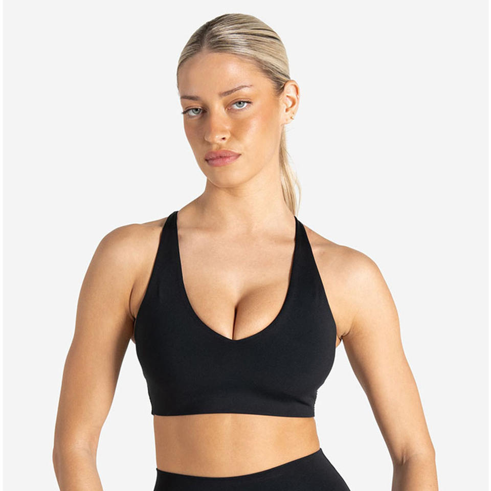 บราเล่นกีฬาสีดำปรับได้พิมพ์โลโก้ได้ตามต้องการรายละเอียดด้านหลังแบบเรียบและยืดหยุ่นมากสำหรับผู้ใหญ่บราเล่นกีฬาฟิตเนสของผู้หญิง