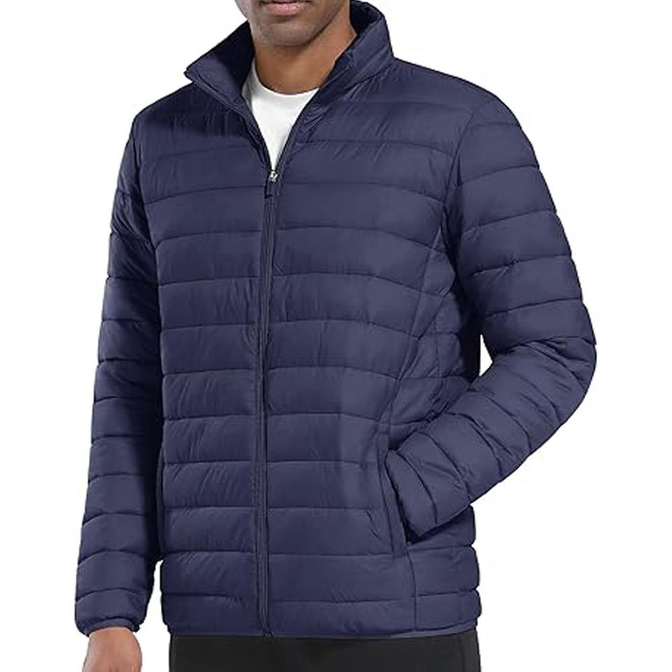 เสื้อแจ็คเก็ตพัฟเฟอร์น้ำหนักเบาสีดำ-น้ำเงินพิมพ์โลโก้ตามสั่งสำหรับผู้ชาย ทรงโอเวอร์ไซส์ กันน้ำ พร้อมซิปปิดแบบอุ่น