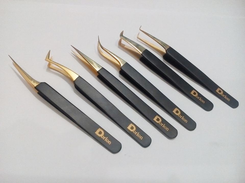 แหนบต่อขนตาแบบเคลือบสีดำพร้อมแหนบปลายชุบทองคีมหนีบต่อขนตาทำจากสแตนเลสโลโก้แบบกำหนดเอง