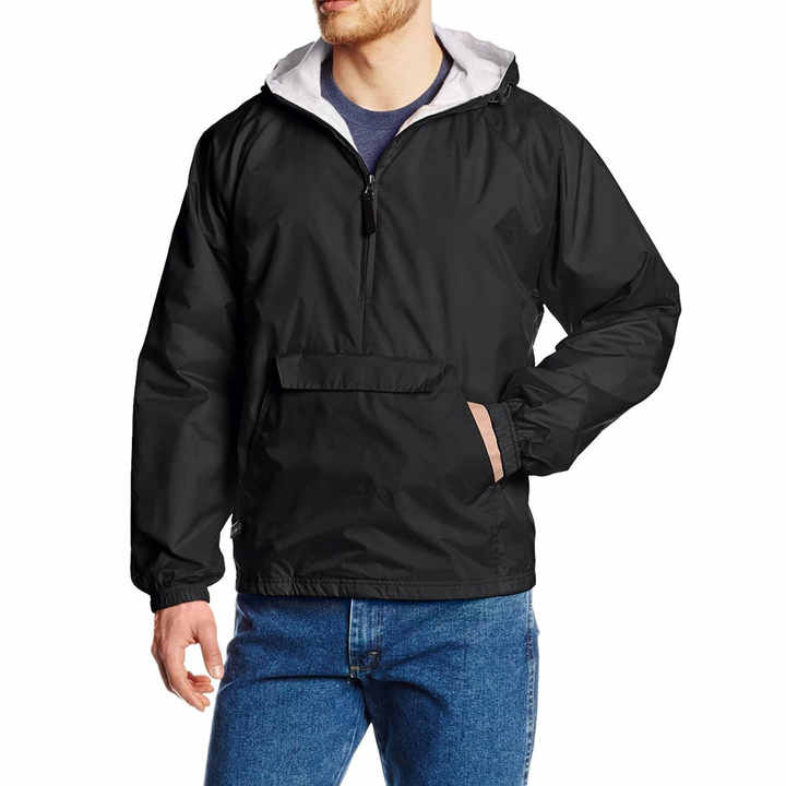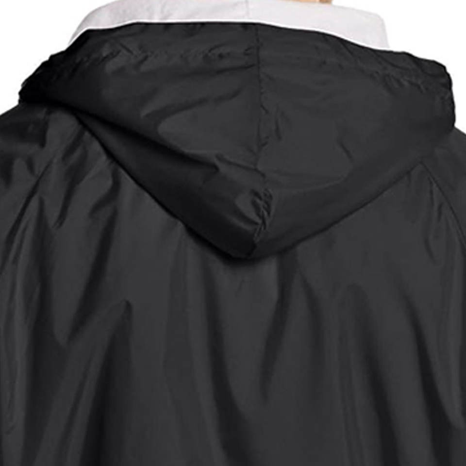 เสื้อกันฝนสีดำปักโลโก้ตามสั่งสำหรับผู้ชาย เสื้อแจ็คเก็ตกันน้ำแบบมีฮู้ด เสื้อกันลมแบบสวมหัว มีกระเป๋าจิงโจ้ ขายส่งเสื้อคลุมกีฬาผู้ชาย