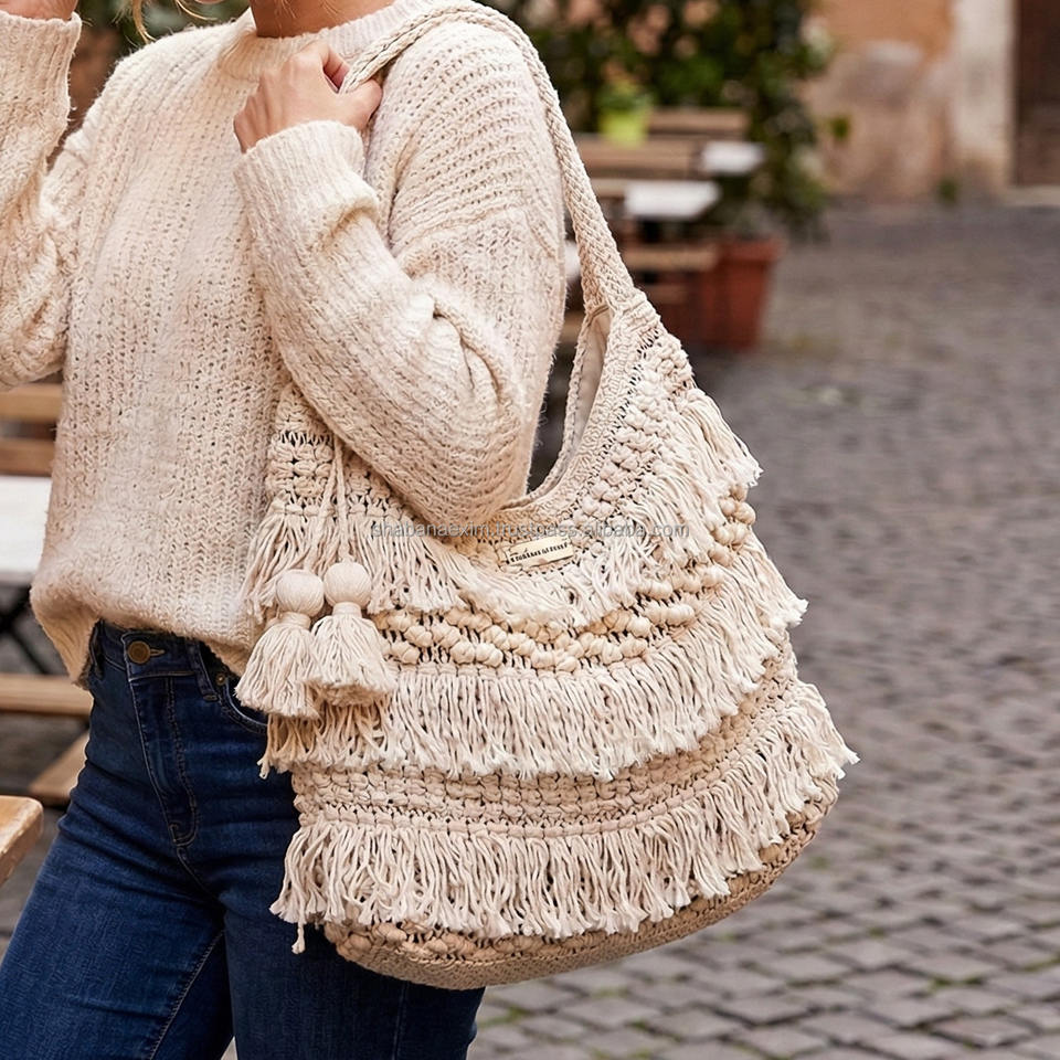 กระเป๋าโท้ทโบโฮปักโลโก้ตามสั่งสำหรับผู้หญิง กระเป๋าสะพายไหล่โบโฮทำมือทนทานพร้อมพู่ห้อย กระเป๋าแฟชั่นสำหรับเดินทางไปเที่ยวทะเลช่วงฤดูร้อน