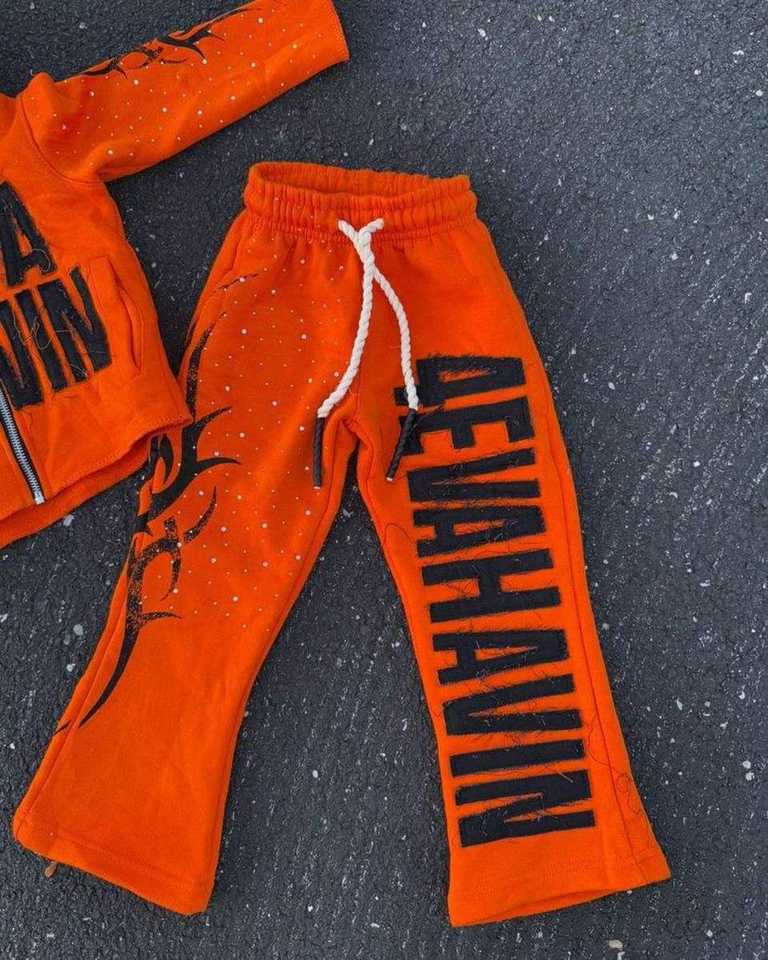 ชุดเซ็ตเสื้อฮู้ดซิปเด็กไซส์ใหญ่ระบายอากาศได้ดีพร้อมกางเกงขาบาน สไตล์สตรีทแวร์ฮิปฮอป 2 ชิ้น พร้อมโลโก้สั่งทำ