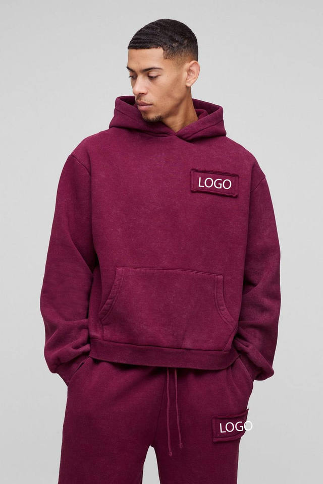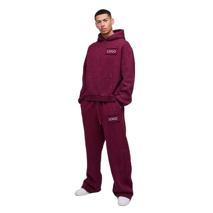 ชุดวอร์มผ้าหนาสีเบอร์กันดีสำหรับใส่ซักเสื้อผ้าแนวสตรีทแบบวินเทจมีหมวกผ้าปะติดมีฮู้ดขนาดใหญ่พิเศษโลโก้แบบกำหนดเอง
