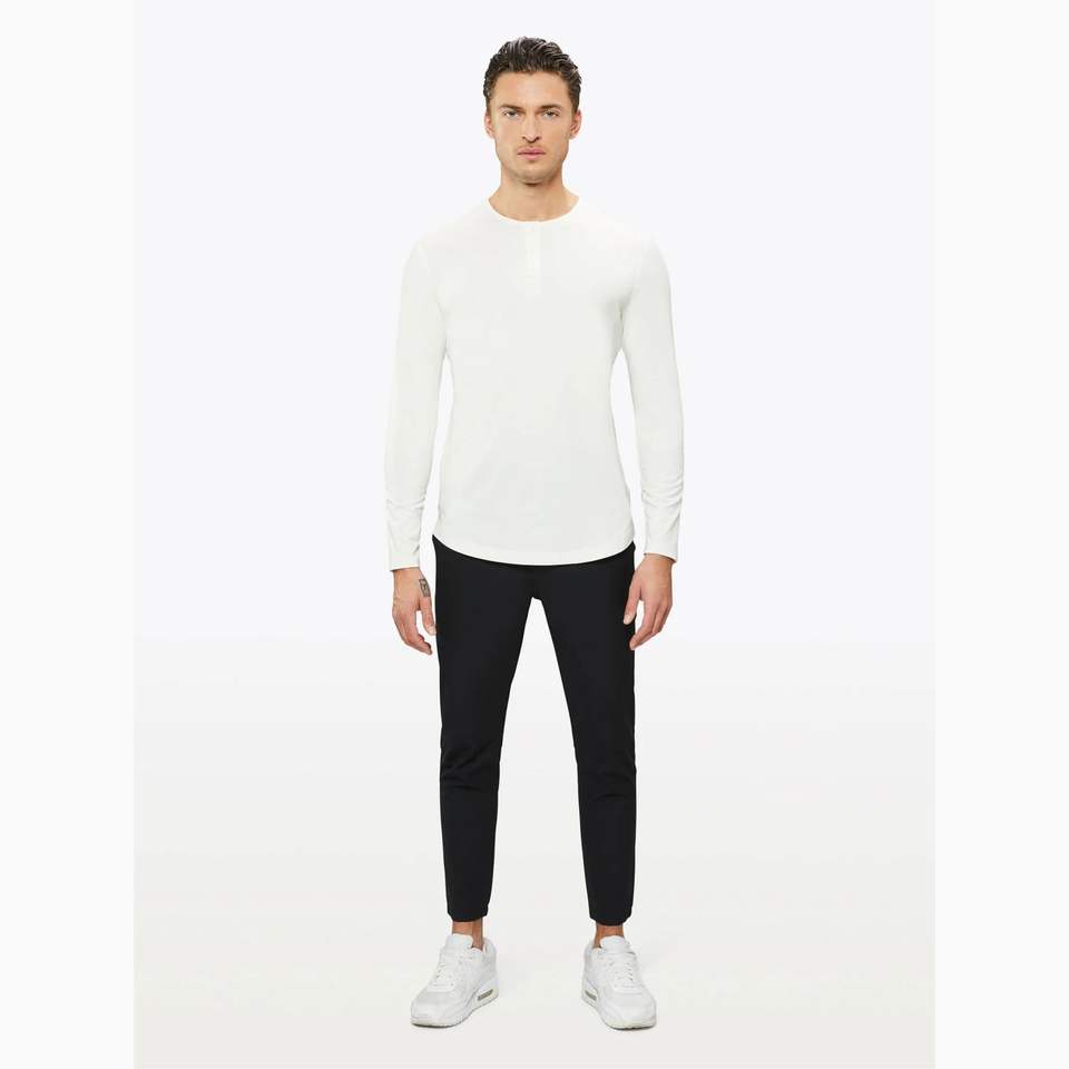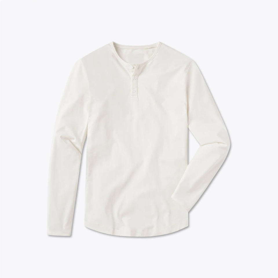 เสื้อ Henley ผ้านุ่มพิมพ์โลโก้ตามสั่งผ้าโพลีเอสเตอร์62% ผ้าฝ้าย33% สแปนเด็กซ์5% แขนยาวชายเสื้อโค้งสีกระดูก