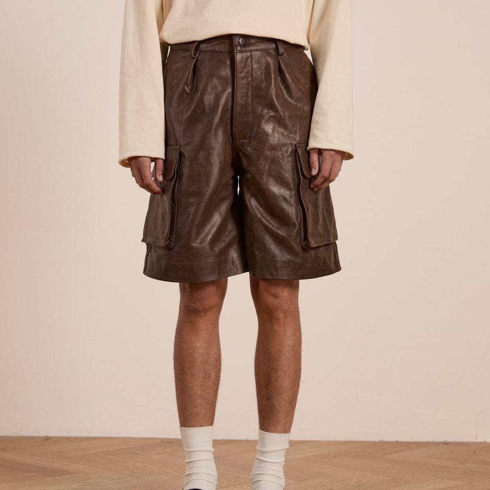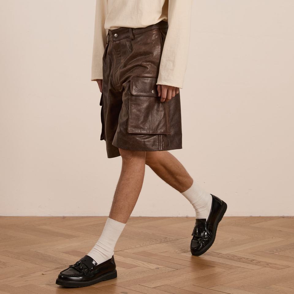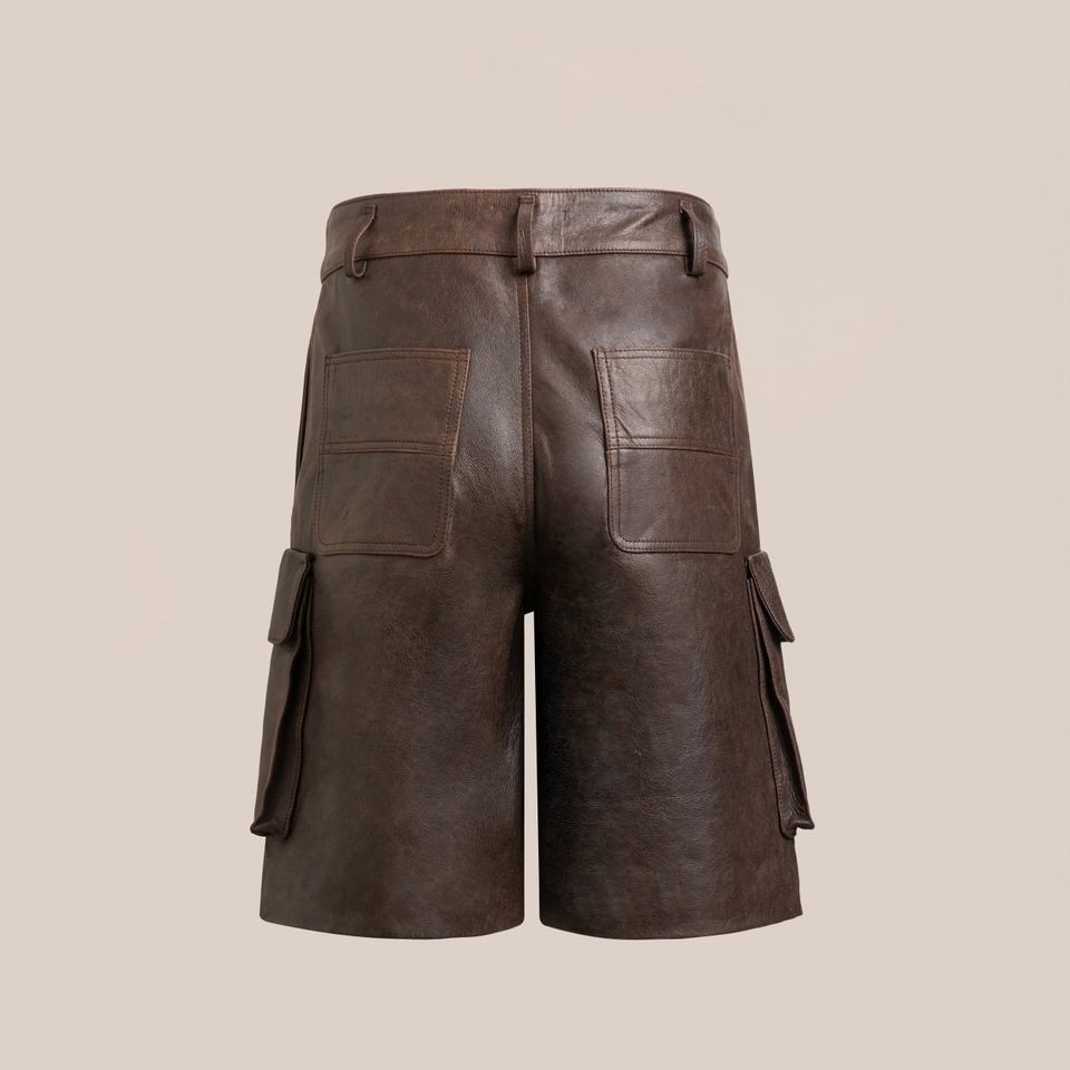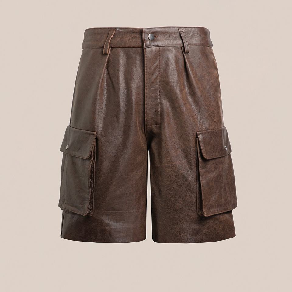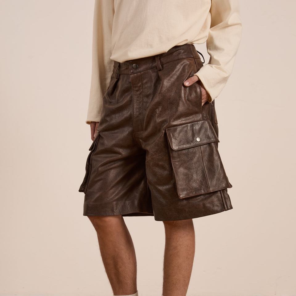 กางเกงขาสั้นลำลองสีน้ำตาลพิมพ์ลายโลโก้ตามสั่ง หนัง PU แท้ แต่งลายขาดแบบ Distressed ทรงคาร์โก้ ความยาวระดับเข่า ลายเรียบ สไตล์สตรีทแวร์