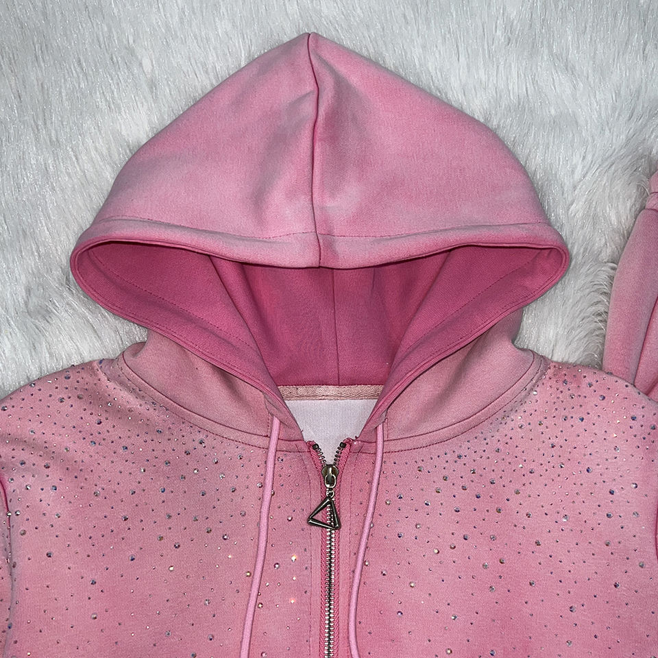 ชุดเสื้อวอร์มลำลองสำหรับผู้หญิงชุดเสื้อผ้าใส่อยู่บ้านมีซิปประดับพลอยแวววาวสำหรับฤดูใบไม้ร่วงฤดูหนาวโลโก้ตามสั่ง
