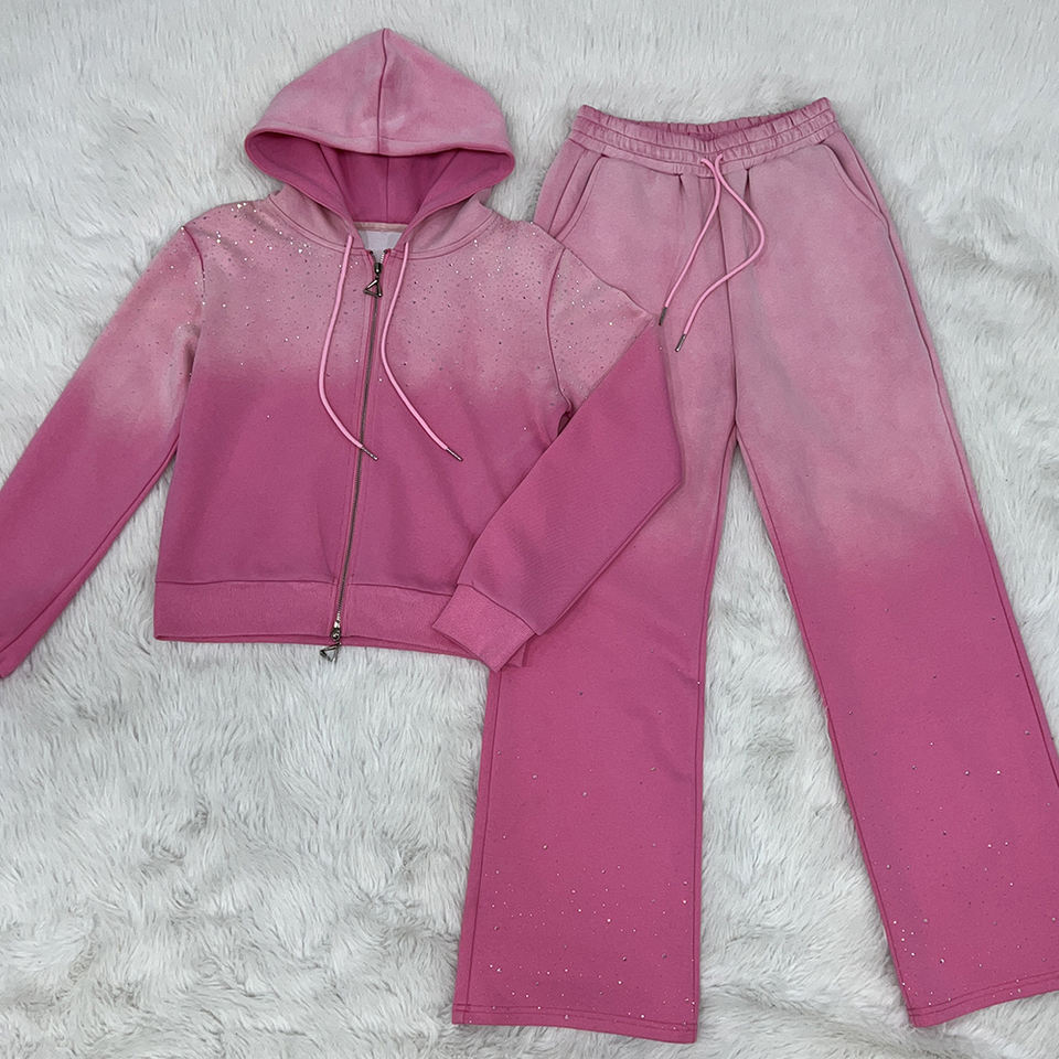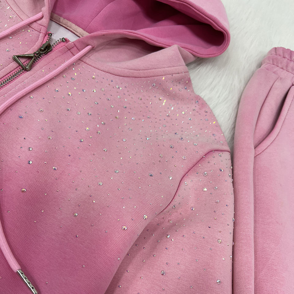 ชุดเสื้อวอร์มลำลองสำหรับผู้หญิงชุดเสื้อผ้าใส่อยู่บ้านมีซิปประดับพลอยแวววาวสำหรับฤดูใบไม้ร่วงฤดูหนาวโลโก้ตามสั่ง