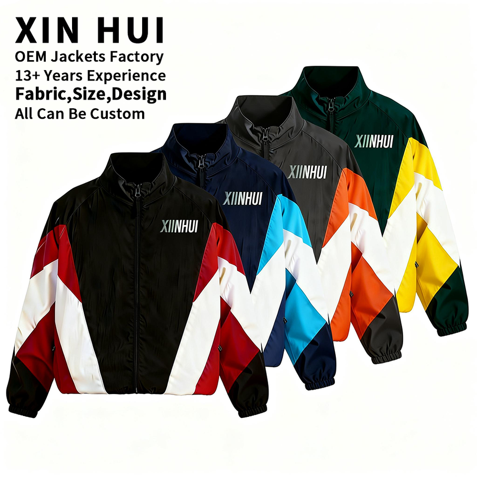 เสื้อแจ็คเก็ตกันลมแบบบางสำหรับฤดูหนาว ลายบล็อกสีสันพร้อมโลโก้แบบกำหนดเอง สำหรับผู้ชาย สไตล์ไฮสตรีท ตกแต่งด้วยผ้าแบบแพทช์เวิร์ค กันน้ำ น้ำหนักเบา ทรงหลวม แบบบอมเบอร์