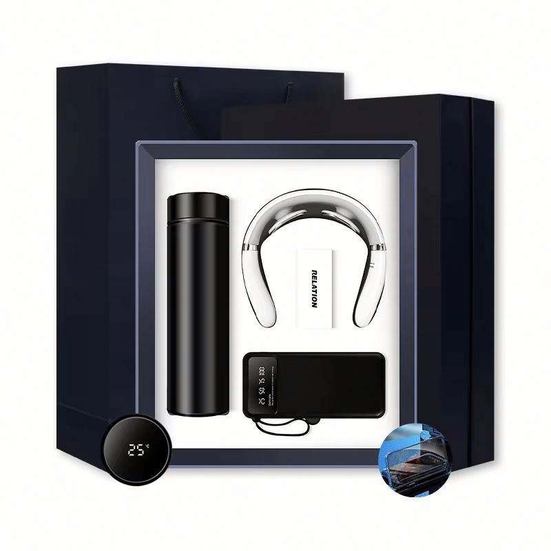ชุดของขวัญพรีเมียมสำหรับองค์กร พร้อมโลโก้สั่งทำ ประกอบด้วยกระติกน้ำสุญญากาศ เครื่องนวดคอ พาวเวอร์แบงค์ เหมาะสำหรับธุรกิจ ใช้เป็นของขวัญส่งเสริมการขาย หรือมอบให้พนักงาน