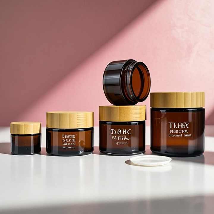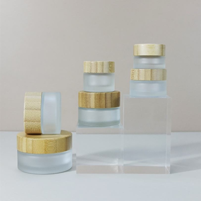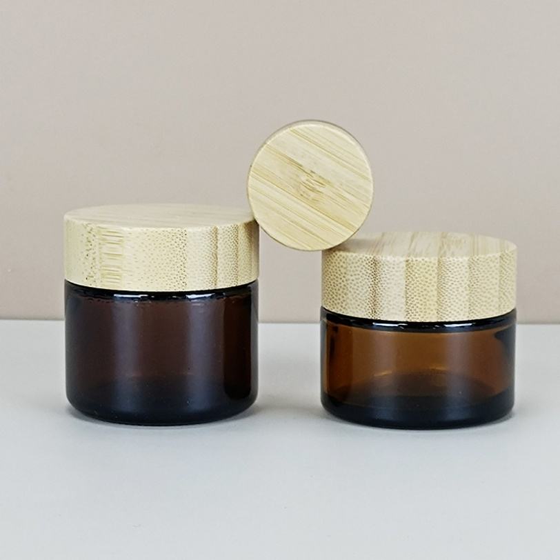 ขวดครีมบำรุงผิวหน้าแบบมีโลโก้สั่งทำ ขวดบรรจุภัณฑ์เนยทาตัวสีเหลืองอำพัน ขนาด 5 กรัม 10 กรัม 15 กรัม 20 กรัม 30 กรัม 50 กรัม 100 กรัม ขวดแก้วพร้อมฝาไม้ไผ่