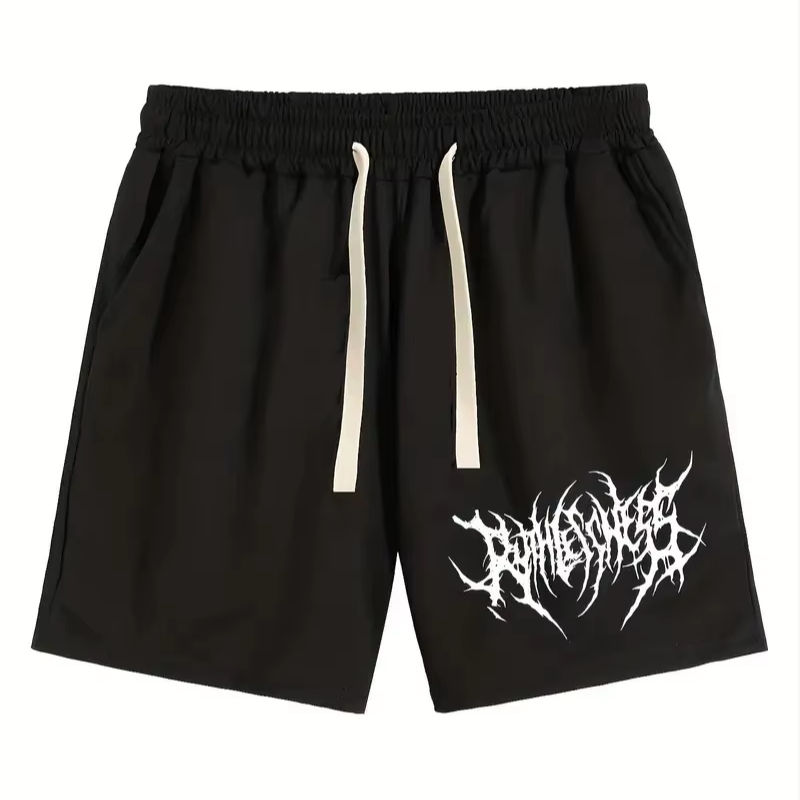 กางเกงขาสั้นผ้าฝ้ายสำหรับผู้ชายกางเกงขาสั้นสีดำลำลองผ้าเมชเนื้อผ้าตาข่ายและเทคนิคการพิมพ์โลโก้ตามสั่ง