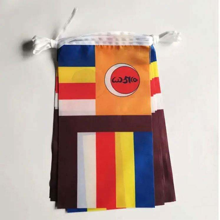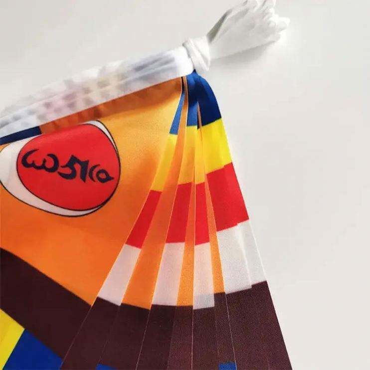 ออกแบบโลโก้ตามสั่ง พิมพ์สีเต็มรูปแบบ ธงประดับสายโพลีเอสเตอร์สำหรับตกแต่งกิจกรรมกลางแจ้งและในร่ม