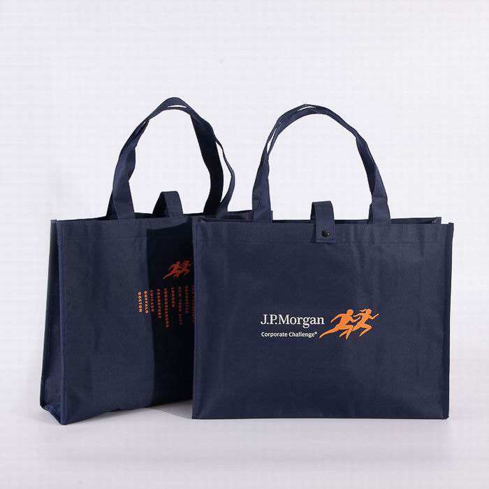 ถุงผ้าช้อปปิ้งผ้านอนวูฟเวนแบบใช้แล้วทิ้งพร้อมที่จับกระดุมใช้ซ้ำได้สำหรับเสื้อผ้าโปรโมชั่นปรับแต่งโลโก้ได้