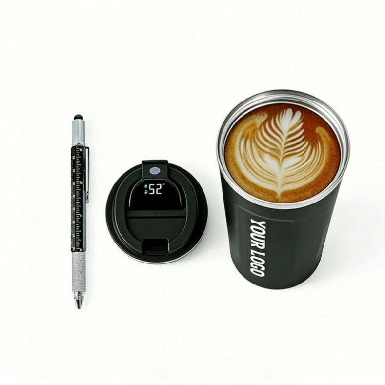 แก้วกาแฟอัจฉริยะสแตนเลสสุญญากาศสองชั้น พิมพ์โลโก้ได้ พร้อมฝาแสดงอุณหภูมิ เหมาะสำหรับเป็นของขวัญส่งเสริมการขายสำหรับธุรกิจ