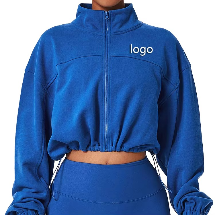 เสื้อครอปมีฮู้ดเปิดไหล่สำหรับผู้หญิงเสื้อสเวตเชิ้ตมีซิปเต็มตัวทำจากผ้าฝรั่งเศสเทอร์รี่ออกแบบโลโก้ได้ตามต้องการ
