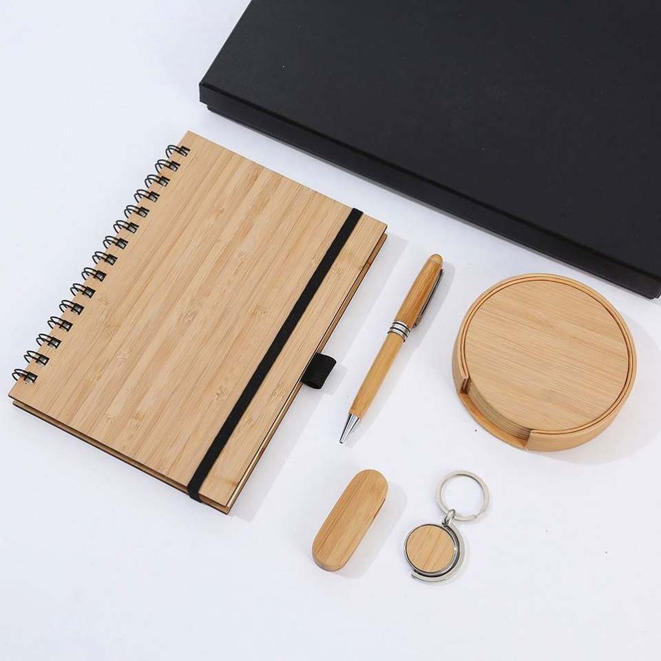 ชุดของขวัญธุรกิจสมุดบันทึกแบบเกลียวทำจากไม้ไผ่เป็นมิตรกับสิ่งแวดล้อมพร้อมพวงกุญแจแฟลชไดรฟ์