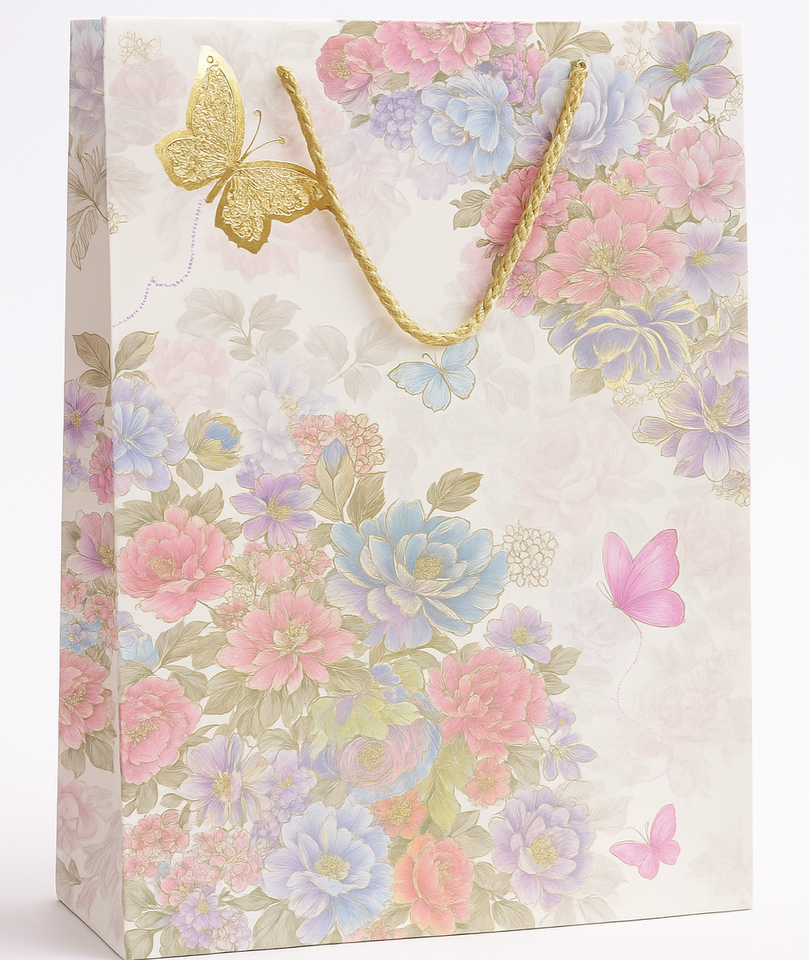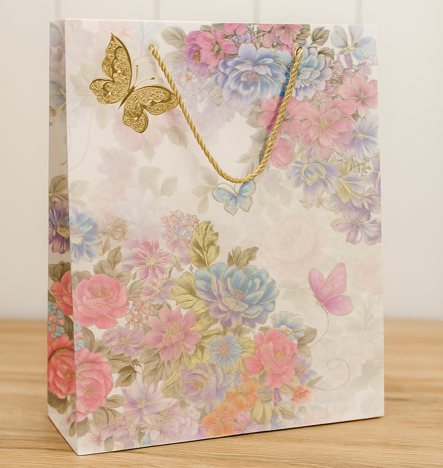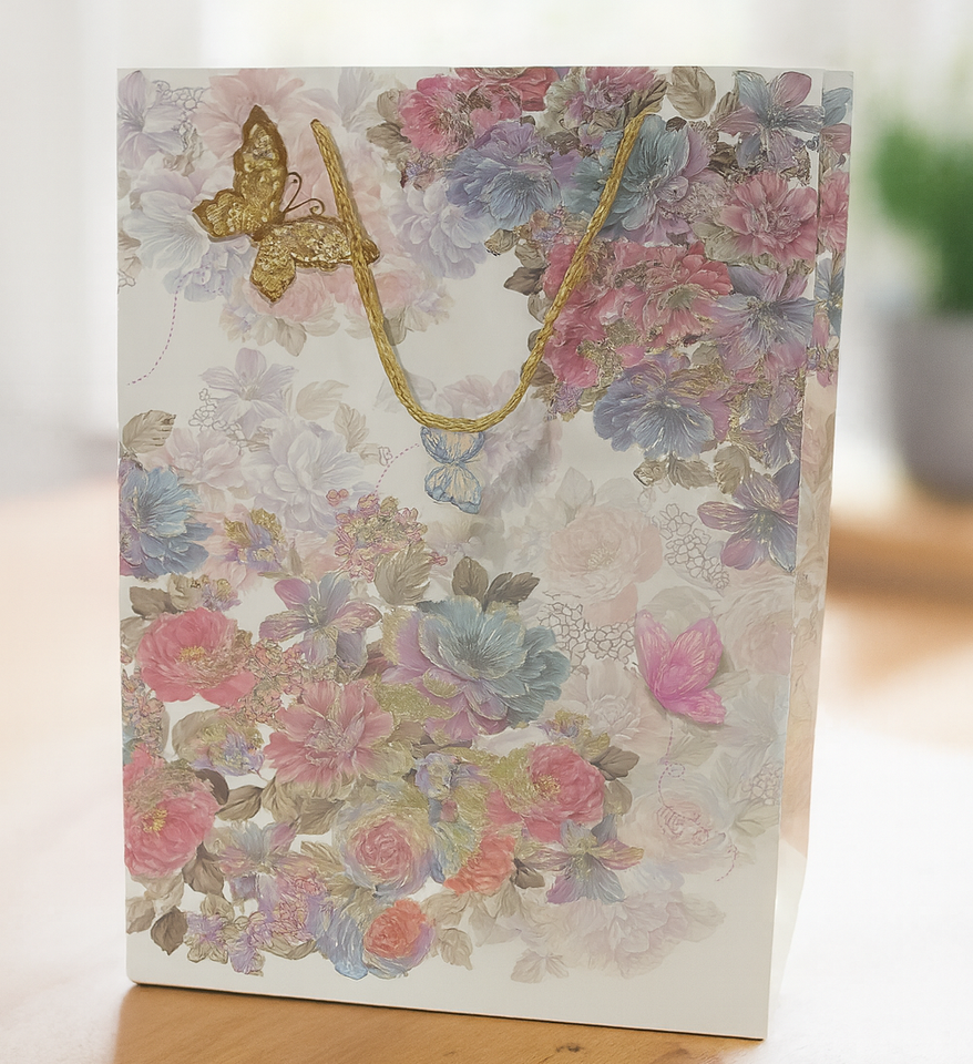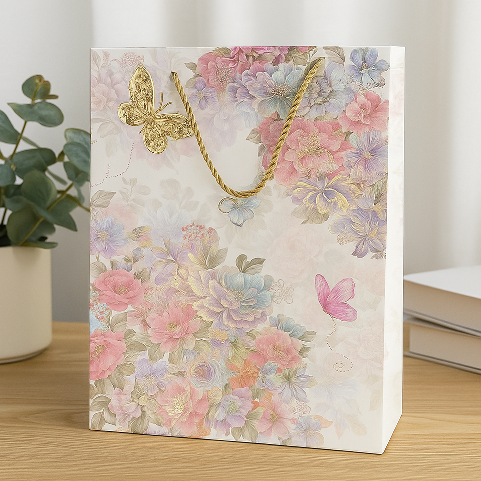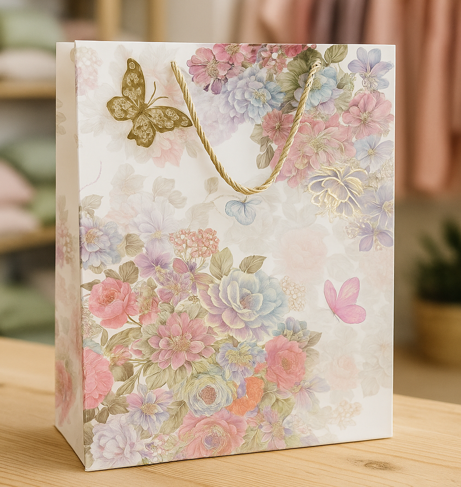 Custom Logo Eco-Friendly Kraft Paper Gift Bag with Colorful Flower Print for Wedding Parties Boutique Use Features Rope Handle
