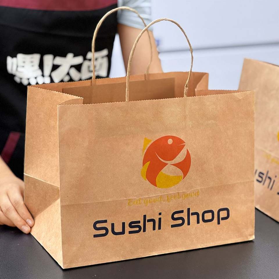 ถุงกระดาษคราฟท์รักษ์โลกสำหรับใส่อาหารแบบนำกลับบ้าน พร้อมหูหิ้ว พิมพ์โลโก้ได้ ย่อยสลายได้และรีไซเคิลได้ สำหรับบรรจุภัณฑ์อาหาร