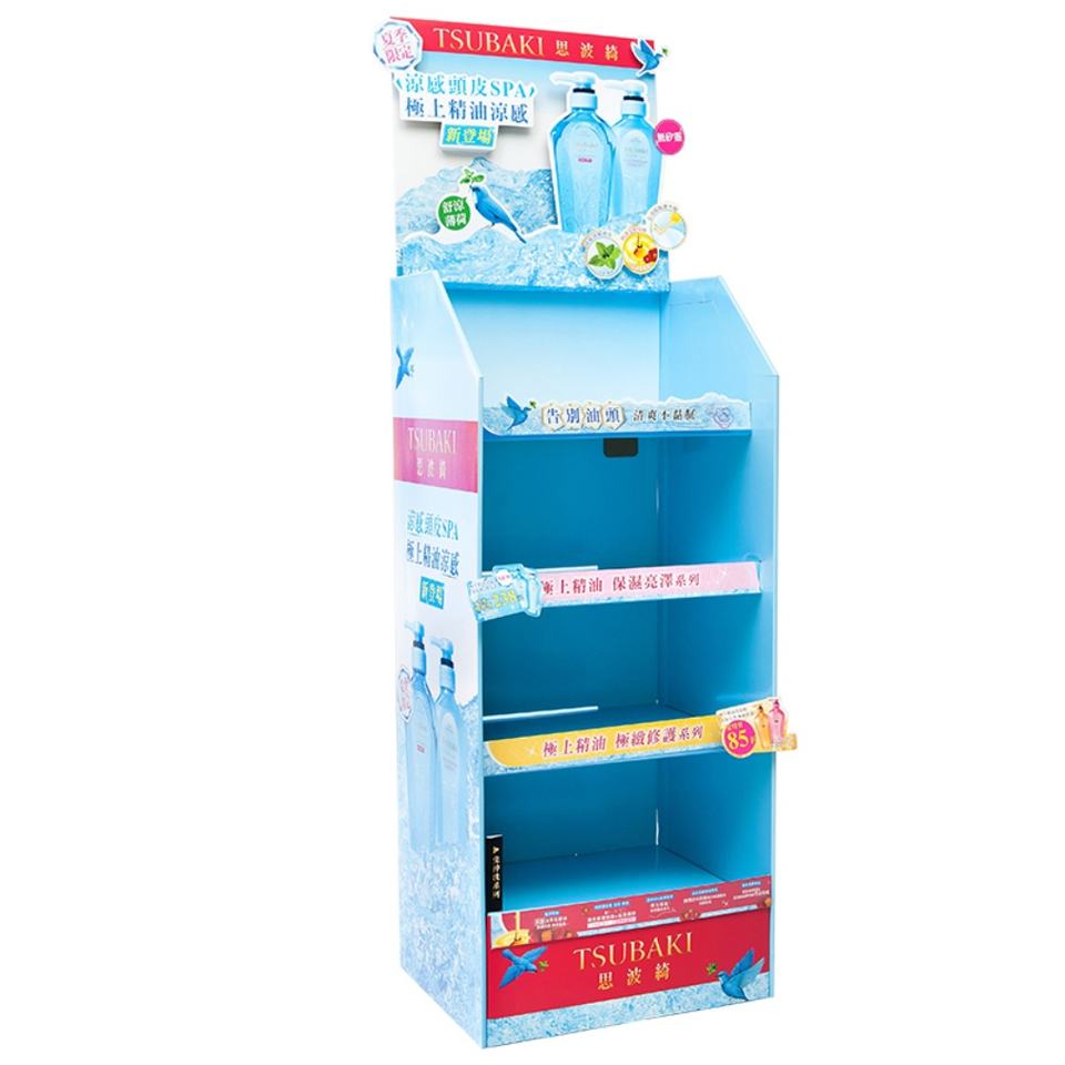 ชั้นวางสินค้าแบบตั้งพื้นพับได้ เป็นมิตรกับสิ่งแวดล้อม พร้อมโลโก้สั่งทำ สำหรับซูเปอร์มาร์เก็ตและร้านค้าปลีก ทำจากกระดาษแข็งรีไซเคิล