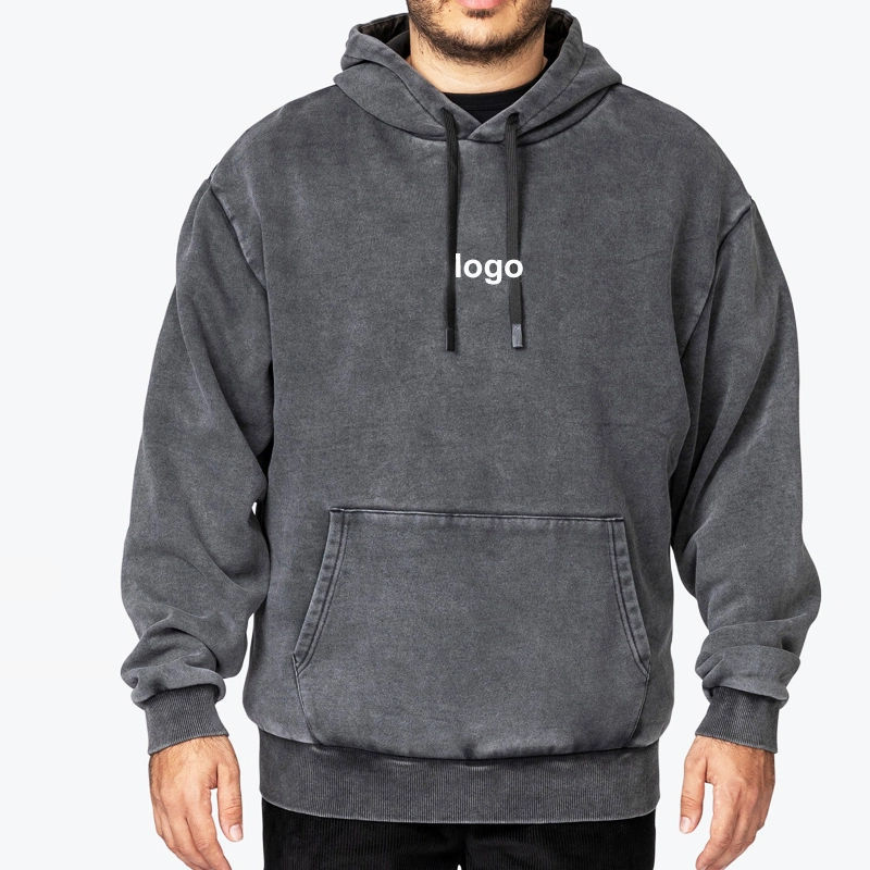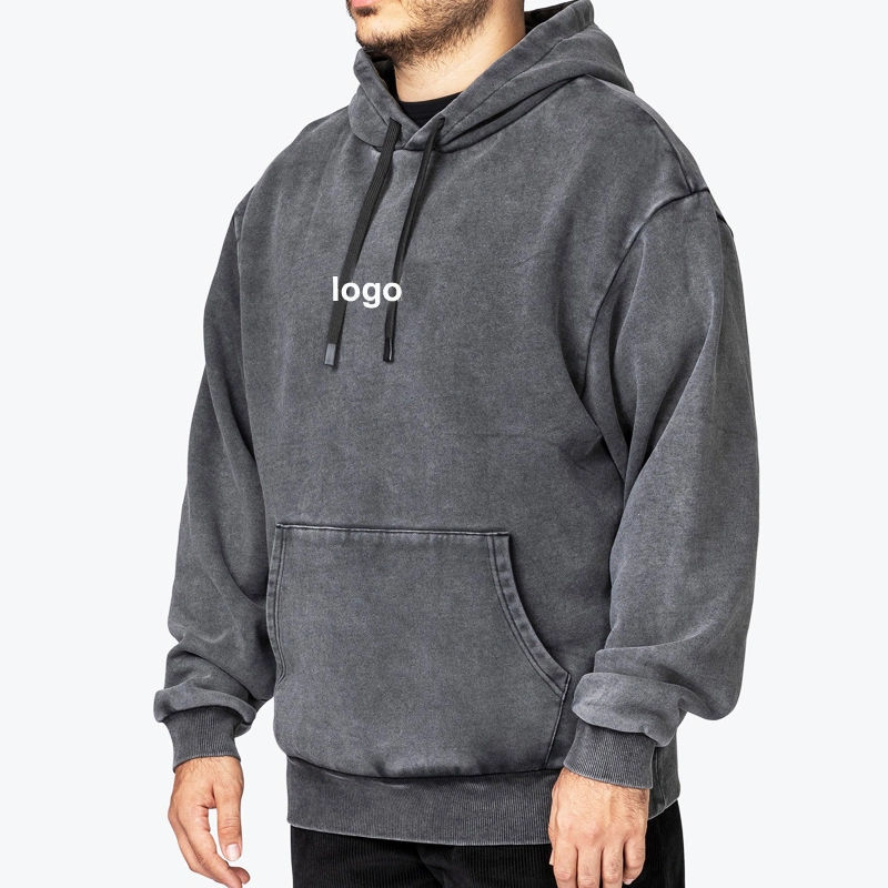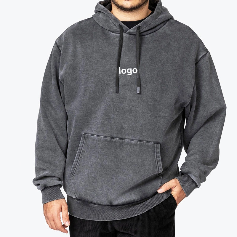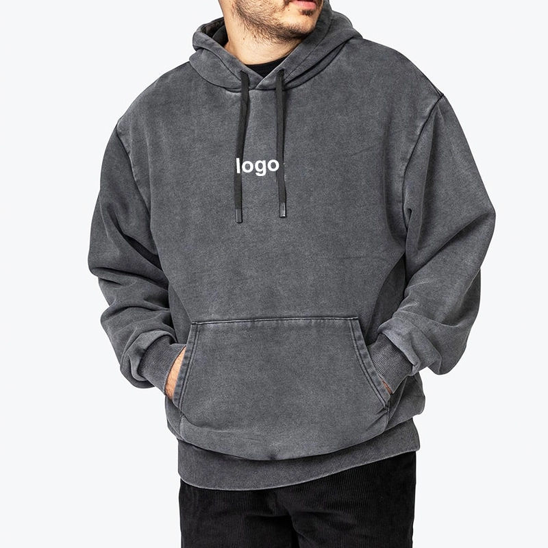 เสื้อฮู้ดดี้ผู้ชายผ้าเจอร์ซีย์คอตตอนหนานุ่ม สีพื้น สำหรับฤดูหนาว ทรงปกติ ฮู้ดใหญ่ ปักโลโก้ตามสั่ง ซันเฟด แอซิดวอช